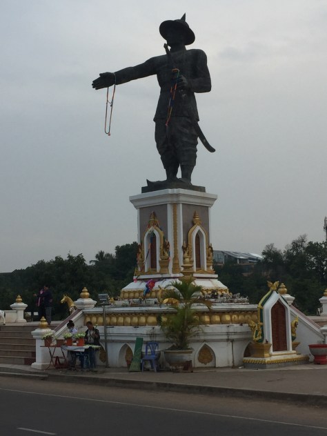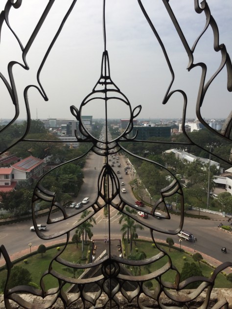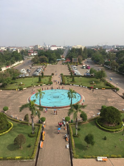 We found ourselves walking up a broad avenue with an Arc de Triomphe like archway at the end. It transpires (we think, because our guide’s English is not very clear) that this was used as a runway during the Vietnam war. Laos was another country not involved but badly affected by it. More of this later.