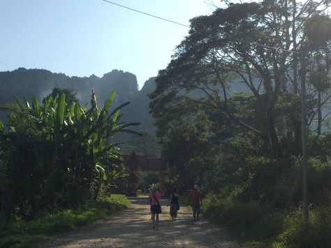 Vang Vieng seems more of a village than a town and nestles in a valley more or less surrounded by mountains. We wandered down the main street where there was a lot of building going on. I thing Vang Vieng has been discovered and is building to accommodate the inrush of guests. I am glad to be here now. I think putting your rice out to dry in front of your house could soon become a thing of the past.