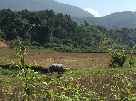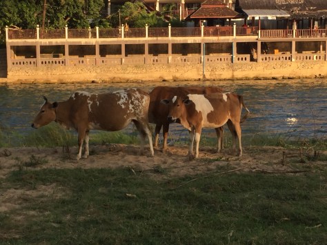 We had our breakfast on the hotel’s terrace looking over the Nam Khan River.. unfortunately it was quite a dull morning (our first), but you could see people working in the fields opposite.