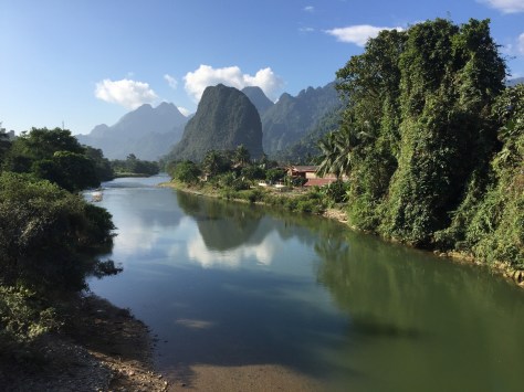All went well until we got out of Vientiane. Our route took us down to the Mekong River where we took our last look at Thailand before turning away and heading out of the town. There was a short stop at the bus station when we feared that more passengers would be boarding (the mini bus was full in our terms!) but thankfully this was not the case and we were soon on the road to Vang Vieng. It was not long before before we realised that the suspension in our ‘smoother’ vehicle was more or less non existent. In these circumstances the back seat was probably the worst place to be. The road, although mostly tarmaced, had obviously been very badly affected by the rains, to the extent that there were vast tracts of just compacted stones and major pot holes. Before long we were being tossed around, leaving our seats and then descending back on to them with something of a bump (for which read thud!). We were hanging on to the handle on the seat in front for dear life as a way of containing our levitation. The journey was to take three and a half hours. The driver was obviously keen to get on (😳) and seemed to gleefully look upon every opportunity to pass the vehicle in front as a challenge to his standing in the racing world. We hurtled up behind things and just before the oncoming vehicle was perhaps a few yards away from it, he would overtake. This added lurching to the bouncing. People were beginning to look rather uncomfortable and I was just thanking my lucky stars for the gene pool that gave me a cast iron stomach.