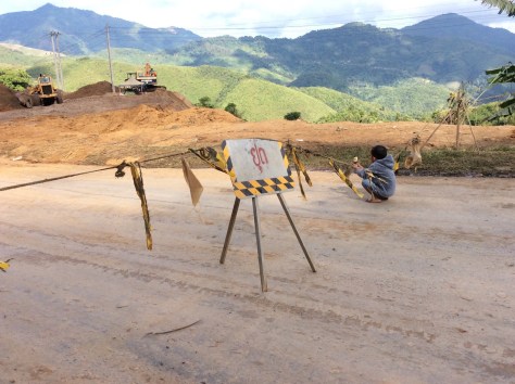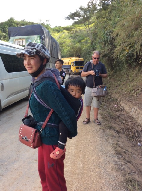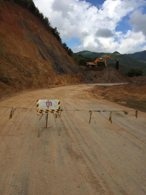 We set off again. Although there were still some ‘up’s’, we were in reality beginning our long descent into Luang Prebang. And it was to be a long one. A very long one. After travelling for about half an hour, we came to a road closed sign and lots of big diggers in our path. They were repairing a land slip that had occurred during the big rains. Best estimate of the time before we could pass was an hour and a half. In the event it was nearer two.