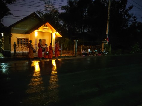 During the lull in proceedings we decided to cross the road to stand in a side street near where the other group of almsgivers were seated. Within a few minutes more monks processed past, each silently bending to take the food and then moving off, taking the turning opposite us and heading off down the road. There was no chanting this time. Just, perhaps, 20 saffron robed figures walking off into the dark.