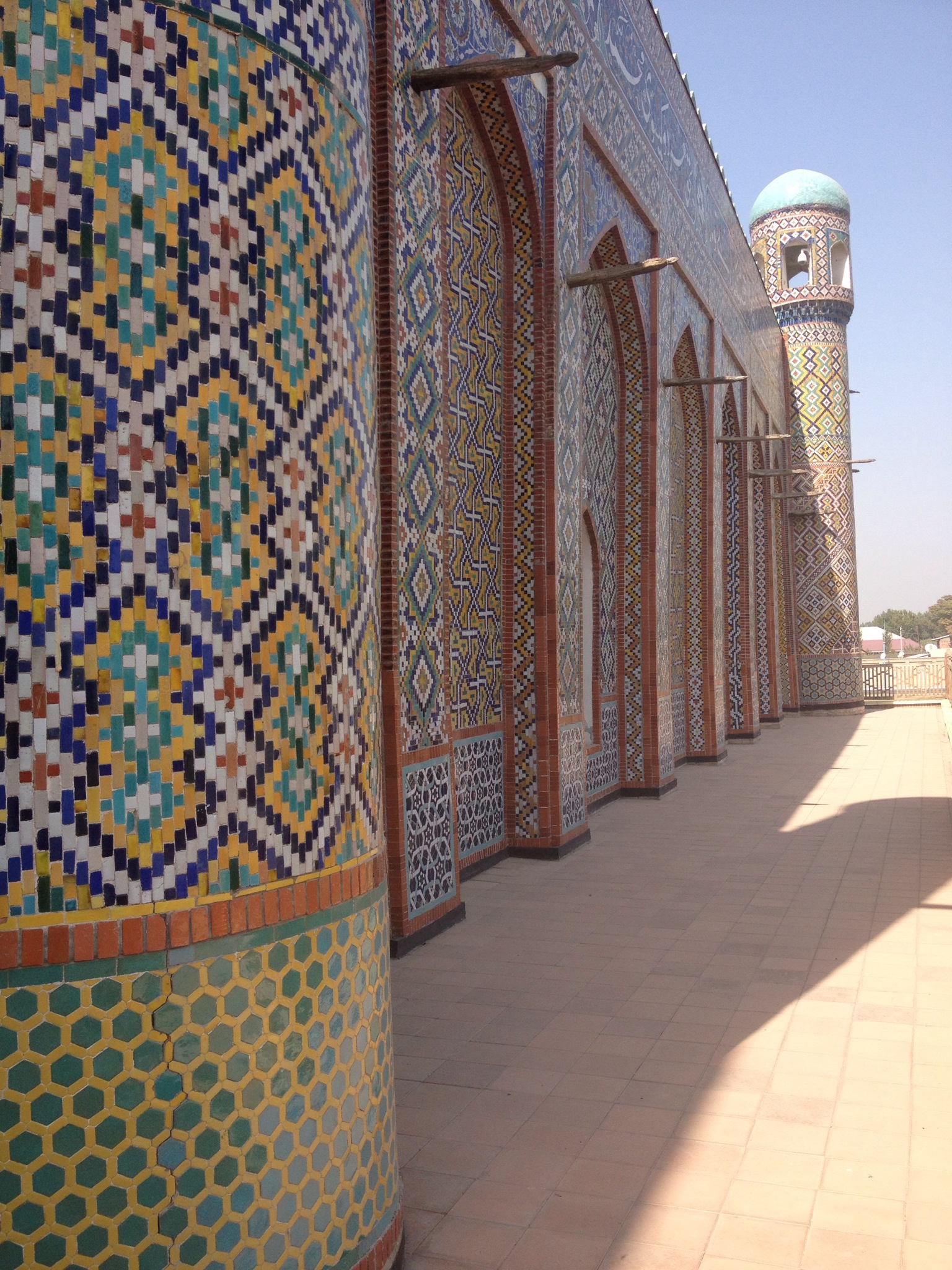 We ate supper in the outside courtyard of a large restaurant called the Samarkand where two men played typical Uzbek music on a drum and violin and lost the battle with the disco music of a wedding inside. The decor of the place was very modern and interesting – a mix of mosaics, whitewashed walls and exposed brickwork.