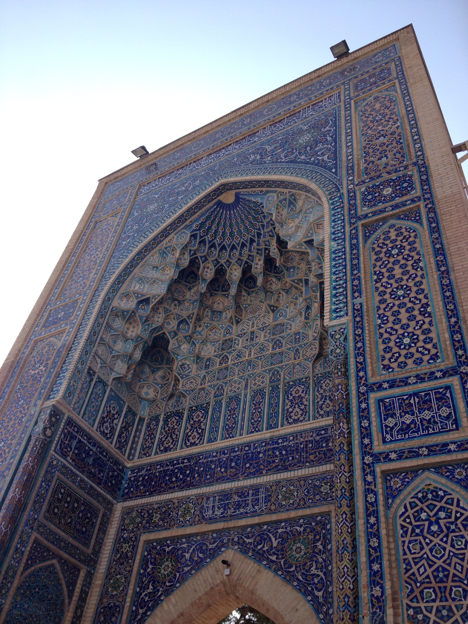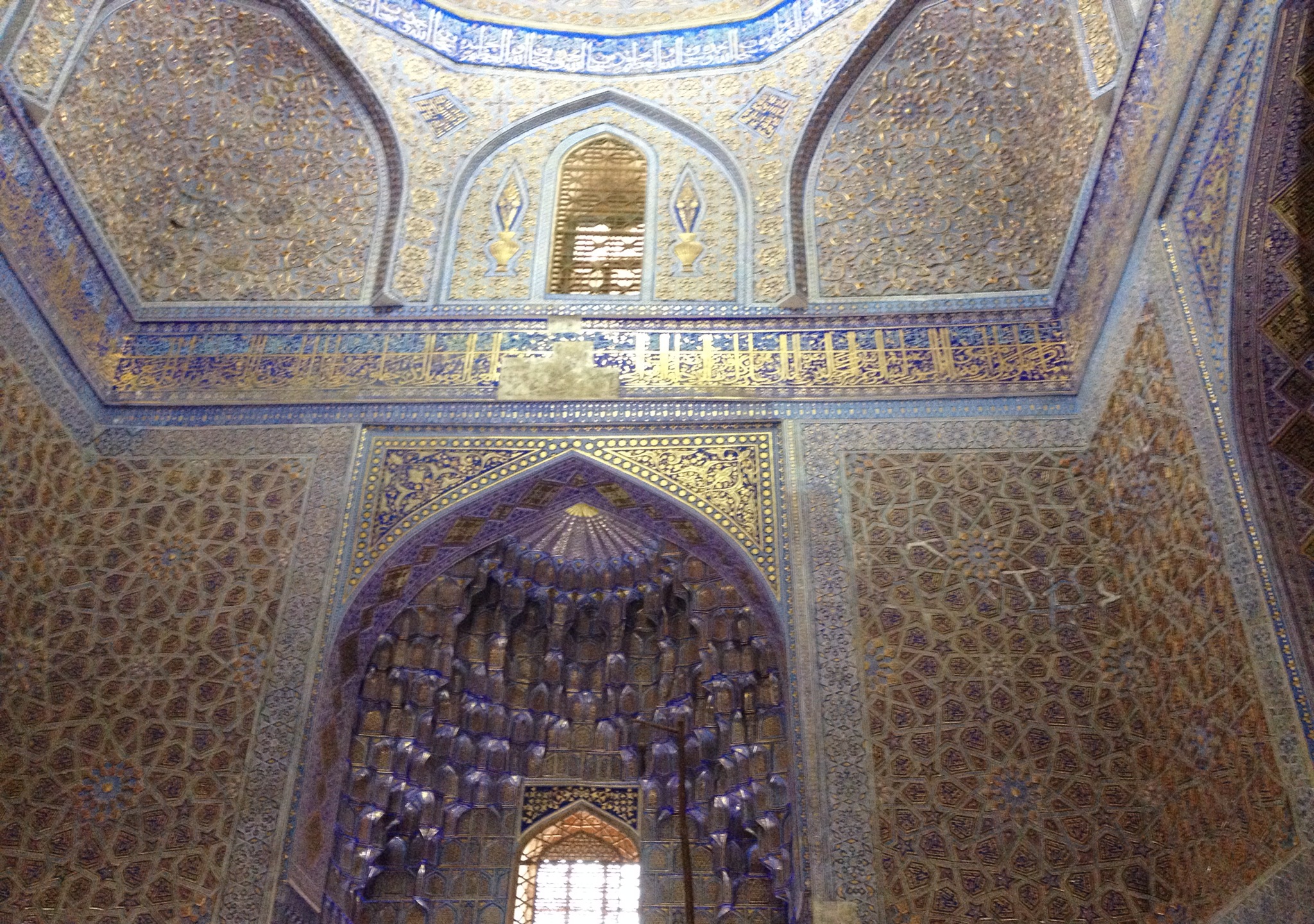 The interior of the mausoleum itself was just incredible, gold and blue glazed tiles shimmered all around us and high up into the inner dome which was gold. On the ground were the tombs. All were huge slabs of marble and jade.