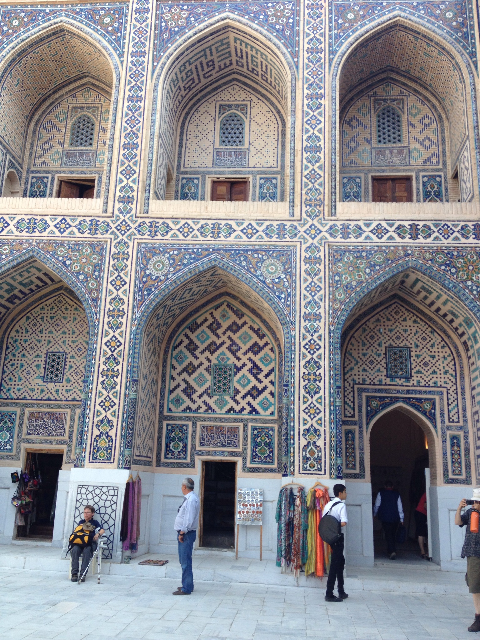 The first building we entered was the madrassa of Ulug Beg, the man who built the Observatory on the outskirts of Samarkand. He was another nephew of Timor and sounds a generally good egg. He believed that everyone was entitled to an education and opened the school for teaching mathematics and astronomy. Once again the building has been renovated by the Russians and later restoration took place as a UNESCO site, but nothing could detract from the beauty of the place. Once again a large portal on the square opened into an inner courtyard with two tiers of ‘classrooms’ surrounding the courtyard. The ground floor rooms are now shops. It would be nice to think that the stall holders who previously filled the square outside made up the shopkeeping population, but sadly this is not the case. The shops were very upmarket, the shopkeepers very well dressed and very different to how one imagines the stall holders of old to be.