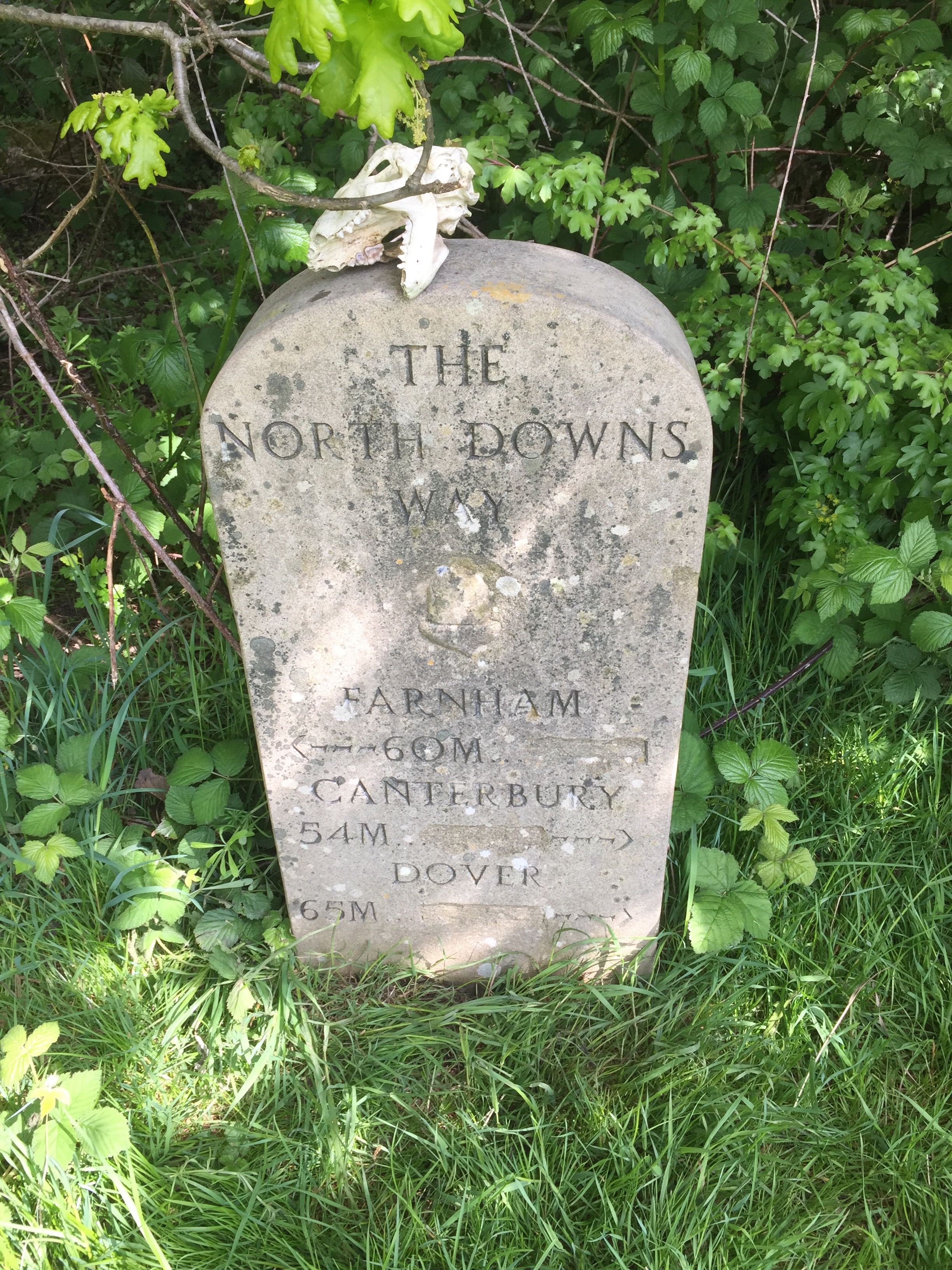 As we skirted Kemsing, dog walkers joined us on their Sunday morning strolls and runners sailed by. We came across a milestone with the distances of the route identified. Ominously there was a skull on the top – a deterrent for the light weights???