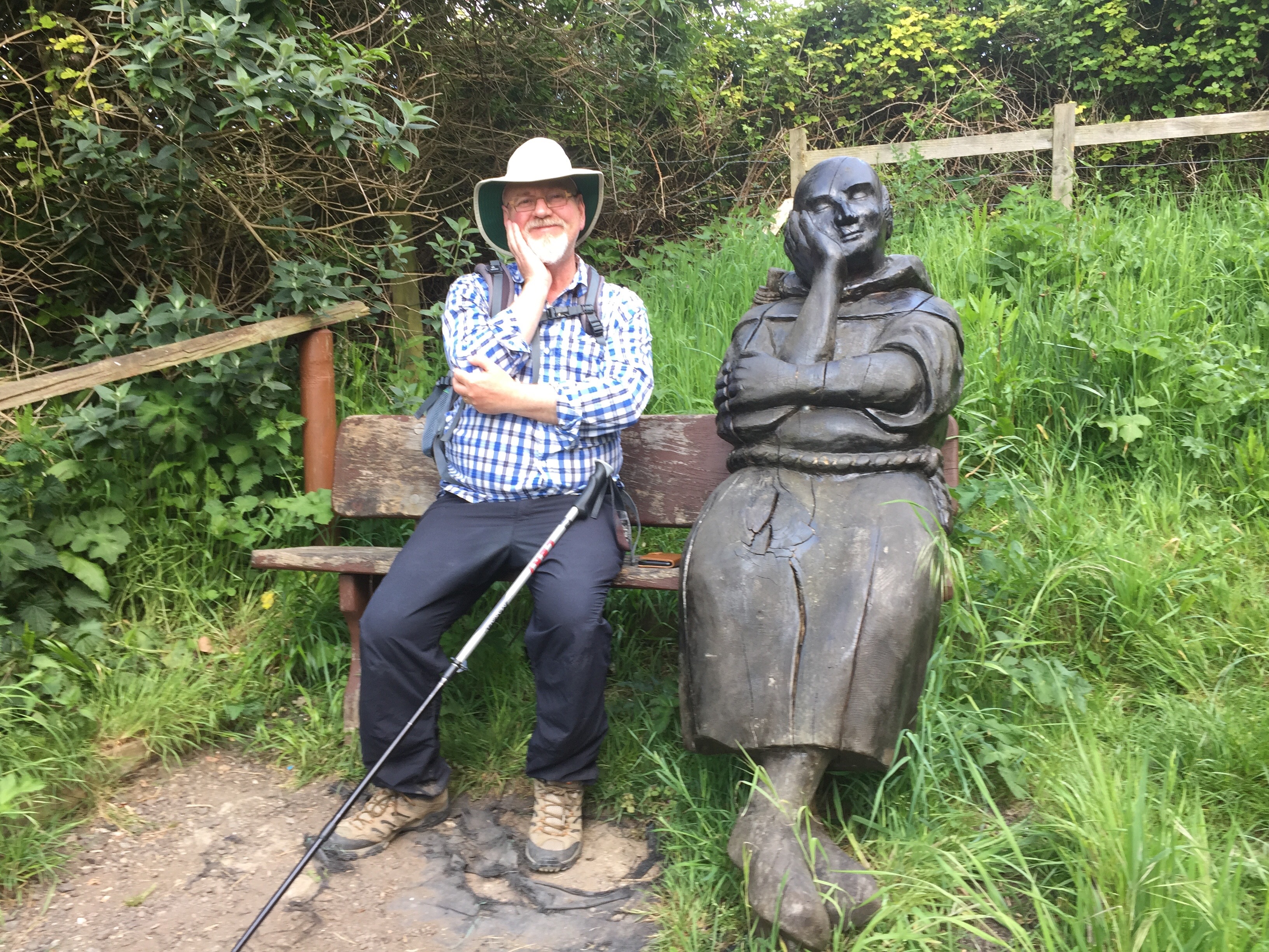 Crossing the road, we continued on the Pilgrims Way. The route became tree lined and about a mile later we came across a carved wooden sculpture of a monk on a bench. The sculpture is the one on the right…….