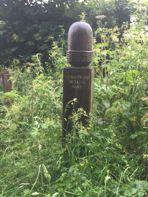 After a very ‘interesting’ breakfast served in a basket delivered to our room and comprising plain and chocolate croissants, porridge in a pot (to have water added – ugh!), fruit and chocolate muffins (white and brown), we set off for a very short days walk (8 miles). First we had to find the Wolds Way as we had turned off the route for Market Weighton and had walked in to the town along the road as it was so wet. With the help of the compass and a lot of peering at the map, we identified our route out eventually and headed out across fields.