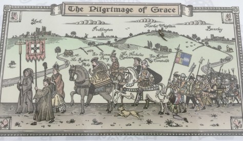 After crossing a minor road, skirting a small wood and crossing a meadow with young bulls in it, we walked along the edge of a corn field with more wonderful views and also an information board telling us about something called the Pilgrimage of Grace, which I had never heard of before. Apparently this was an uprising of northern Catholics against Henry VIII’s dissolution of the monasteries. In the end there were 50,000 involved in the stand against the King. Amazing and something I need to know more about!!