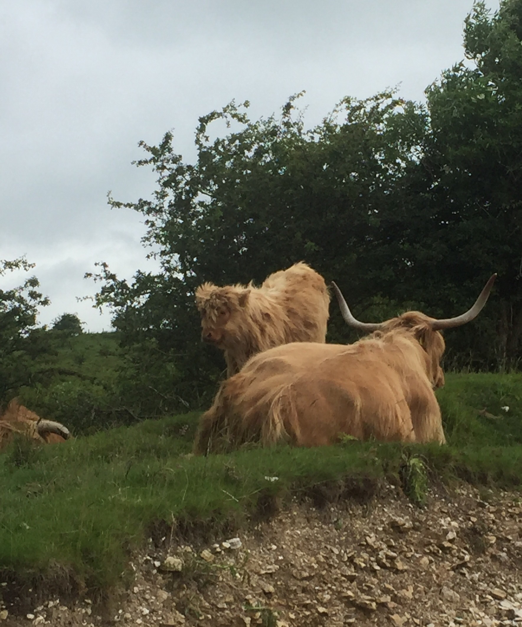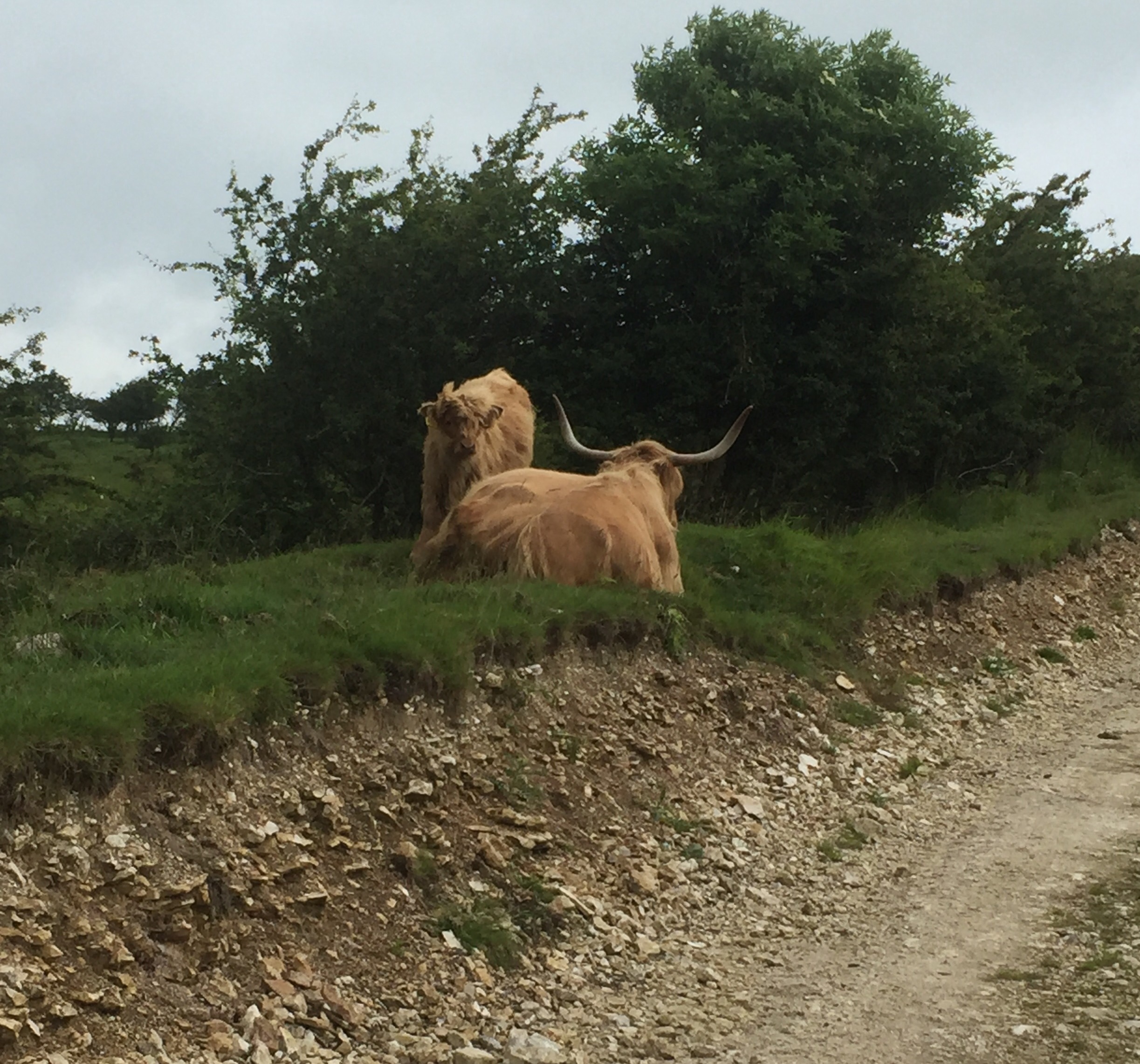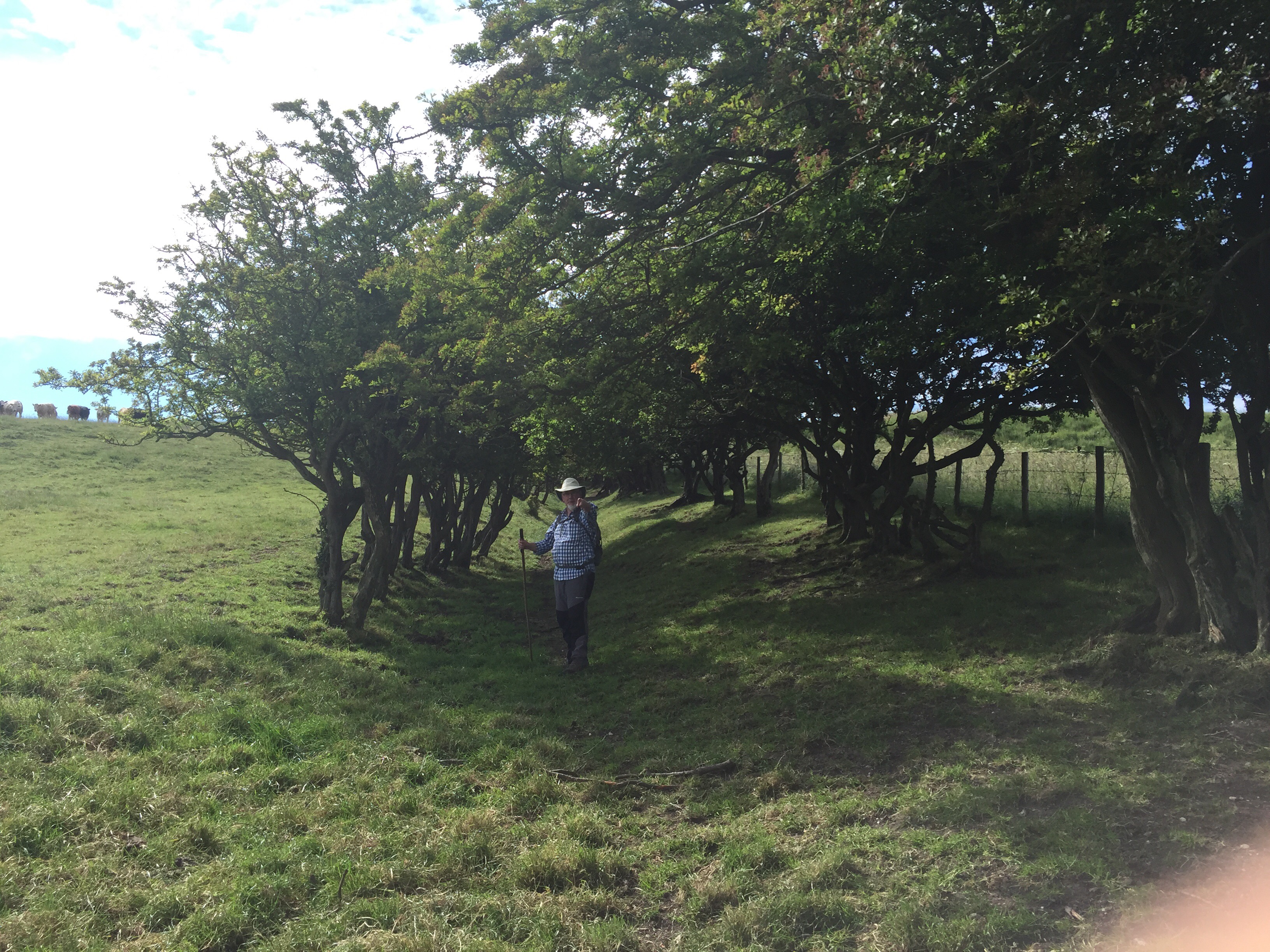 The ground was uneven and covered with grass, with thistles, burdock and nettles waist high on both sides. We ploughed up the hill and then turned up past a row of gnarled old trees. As we moved up the avenue a line of cows appeared on the hill top behind it.