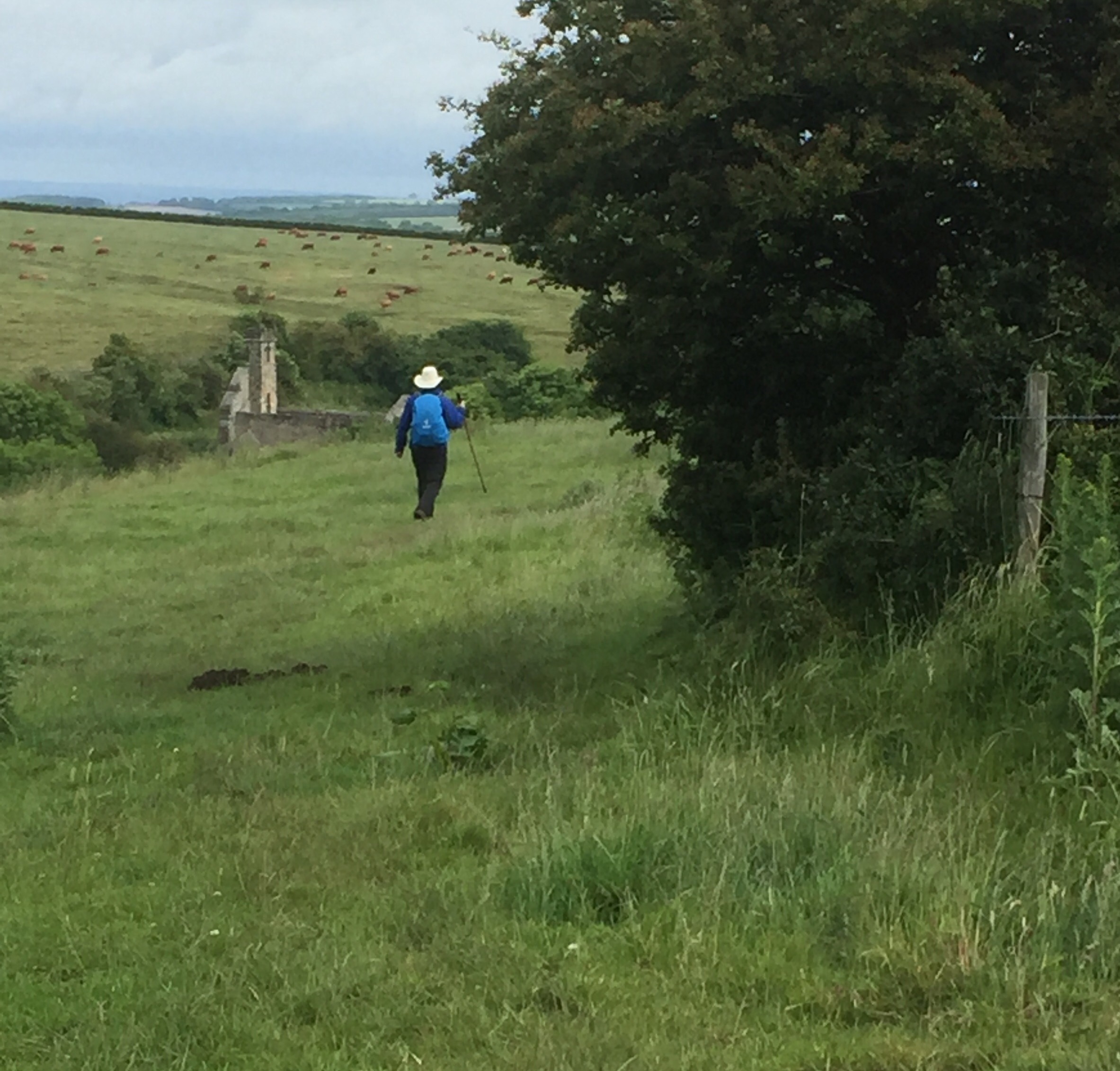 When we turned off the road about 350 yards further on we began the most difficult part of the whole walk. The path had not been cleared so we struggled with the terrain, but after a big deep down slope and rise we then started on a big dog leg around the top of a hill with the slope of the hill constantly with one foot hitting the ground lower than the other. It was very uncomfortable. Then to add to our discomfort a way sign appeared telling us we still had seven miles to go when we reckoned we had already done 7 and probably had just five miles outstanding. It was pretty discouraging.