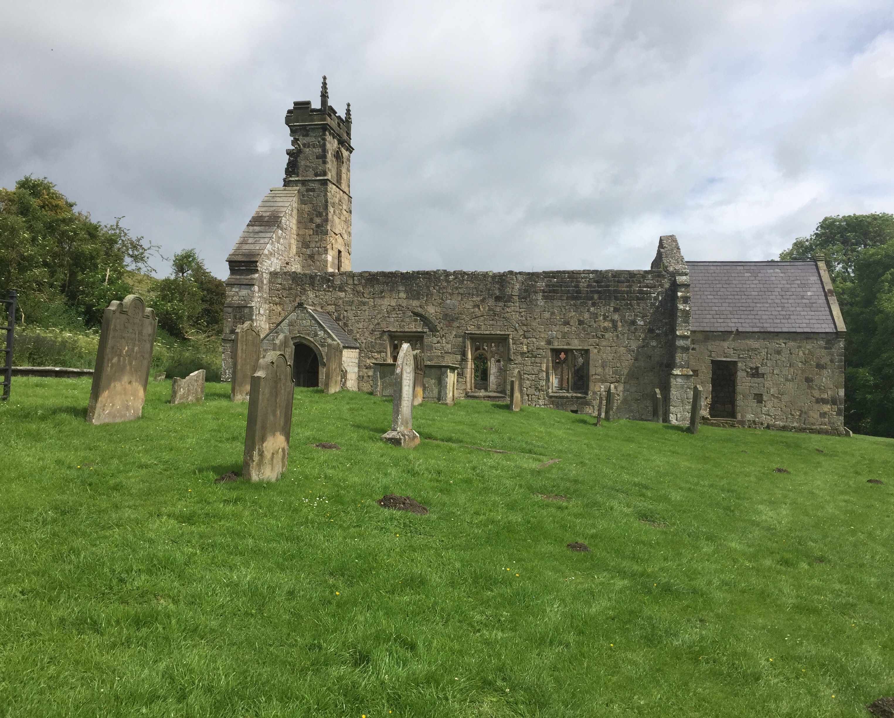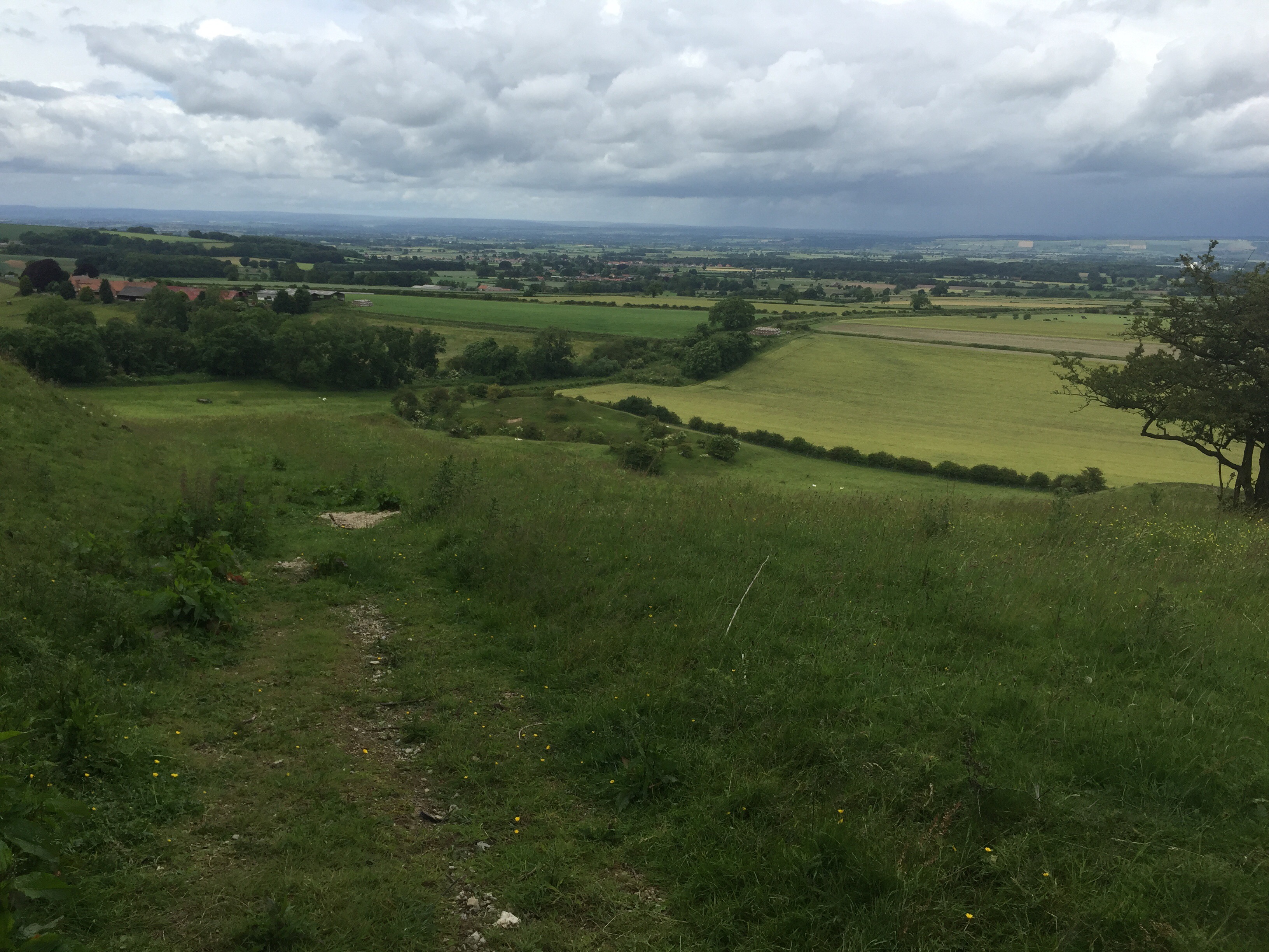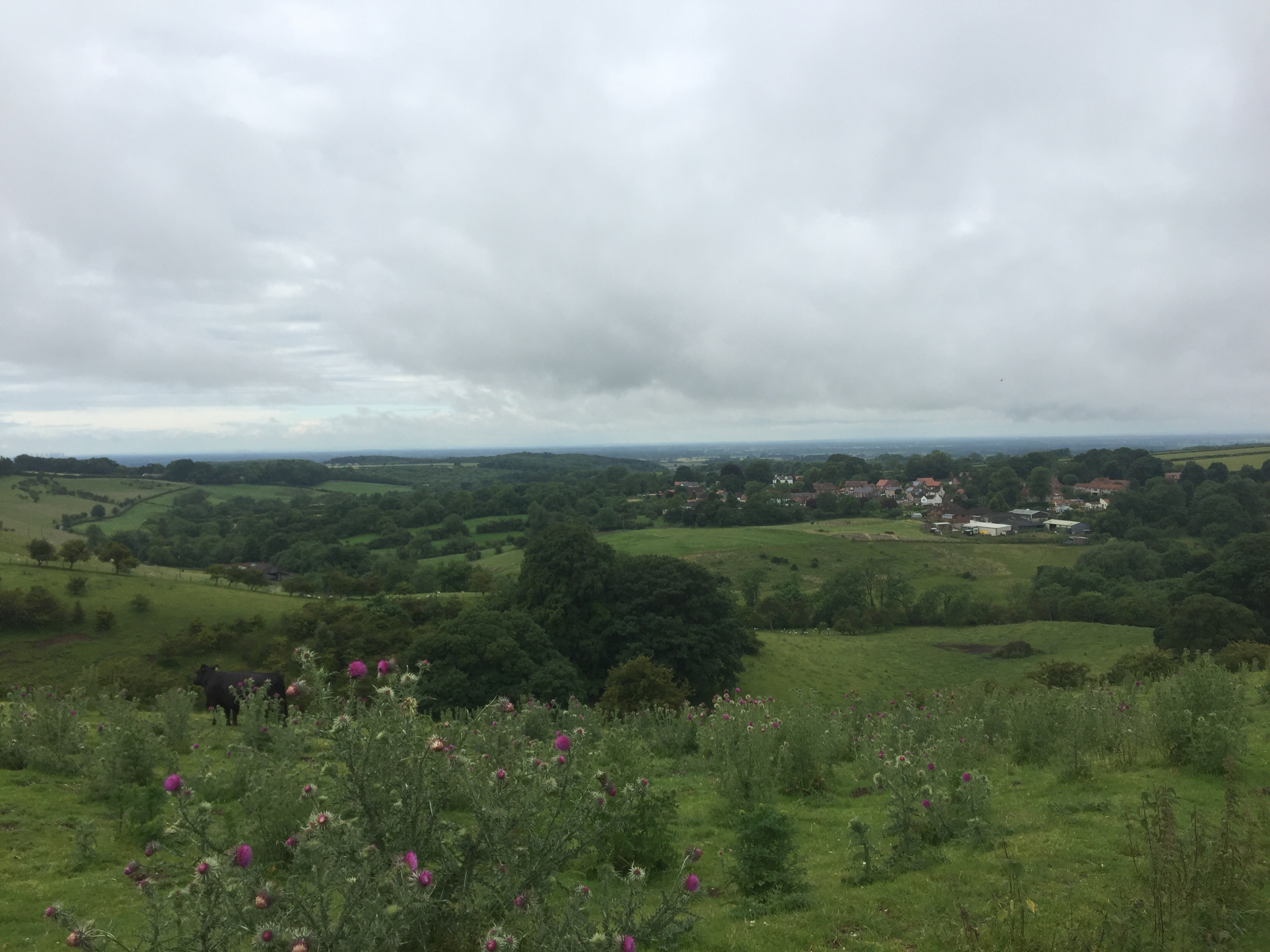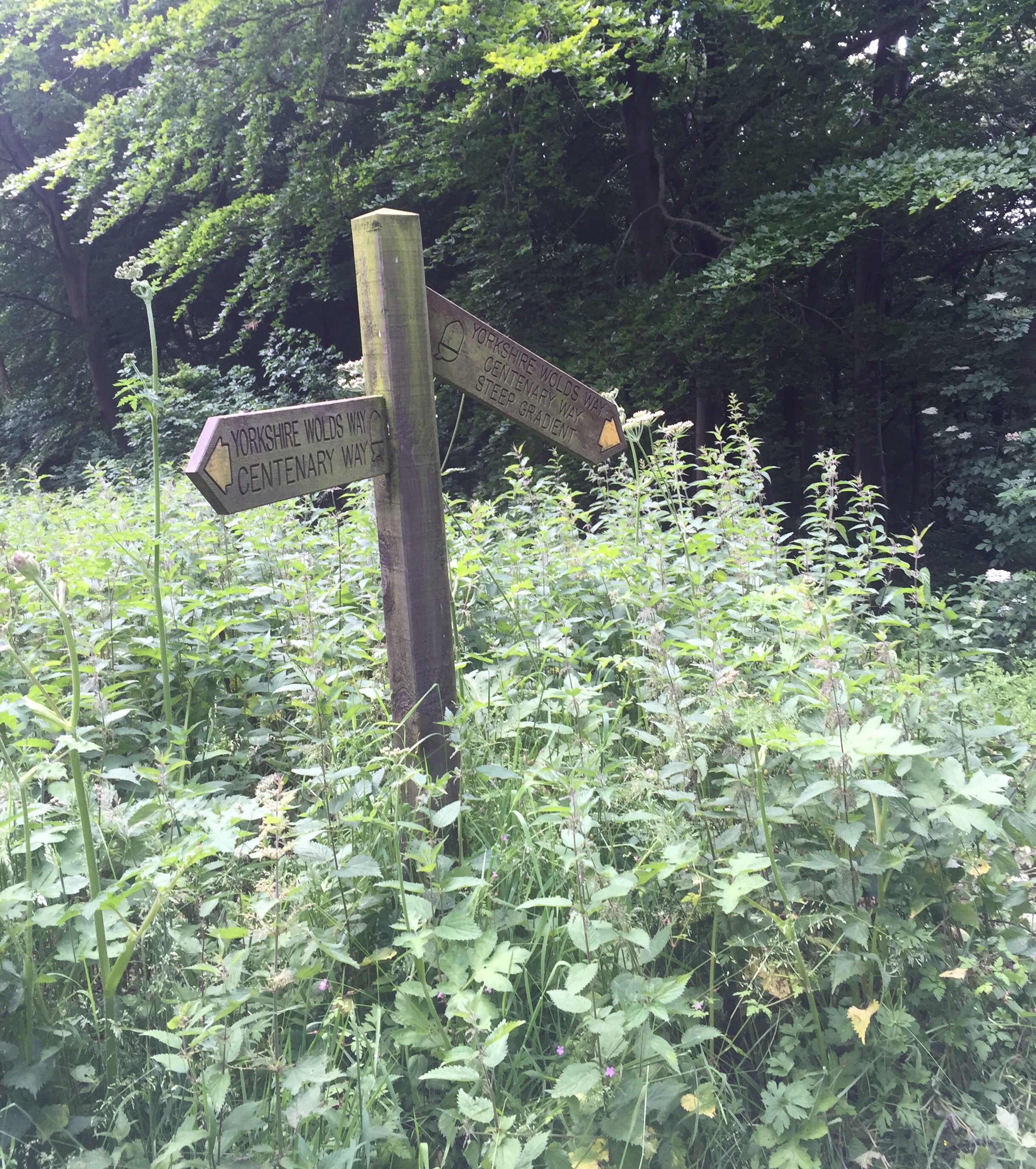 We turned off the Main Street and over the stream that runs down the side of the road. After walking alongside a hedge with the spire of the 14th century Ganton church behind us, we turned up hill along a path that was quite hard work and set the tone for the day really.