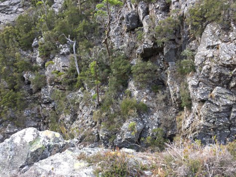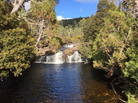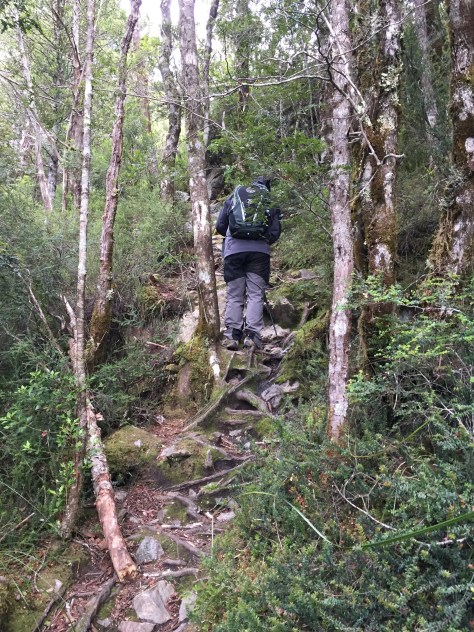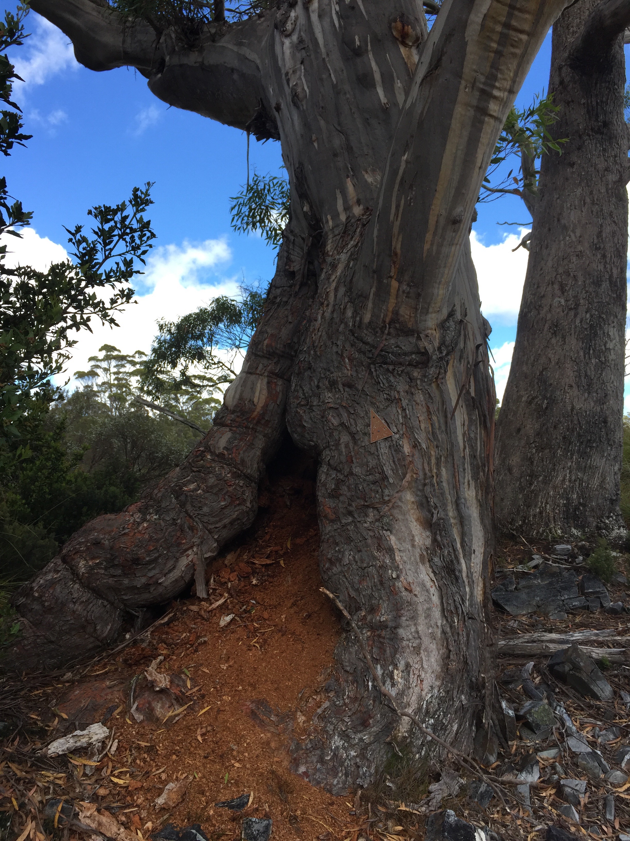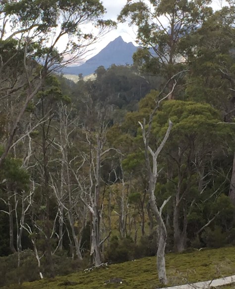 Shortly afterwards, we reached the trees again and entered a silent forest. It was lovely. The light was muted and a clear blue sky could be seen above the tall trees. Heaven! A couple of currawongs followed us for a bit. We meandered along a path that was not always clear – unusually. Most of the paths we have followed in the national park have been clearly sign posted. It was here particularly that I thought about what I had read about aborigines in the area. Apparently, an English chap decided to send all the aborigines that they found off to Robinson’s island for a programme of ‘civilisation’. Many of them were transported there and then, the report said ‘the final family were captured twelve years later’ I could imagine an aboriginal family hiding in this silent place, terrified of these white men who hunted them like foxes. Another not proud moment for the British. Before ‘our’ arrival, the Cradle Mountain was on the travelling route of tribes of aborigines who hunted and fished in the area.