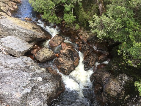 It had fallen to me to choose the day’s walk. Having looked at the options I thought the Dove Canyon Circuit fitted the bill nicely. ‘This 5km Circuit crosses buttongrass plains, open forest and myrtle rainforest to the deep gorge of the Canyon. Numerous waterfalls on Pencil Pine Creek, including Knyvet Falls. Some short steep climbs and descents. Some sections which are rocky, muddy and could be slippery.’ Fair enough. Not outwith our experience and similar to the previous days walking……. Now here’s the thing – my advice now is never to take a walk where gorge, canyon and ‘rocky’ are involved in the same description. We found out the hard way – by doing it đł