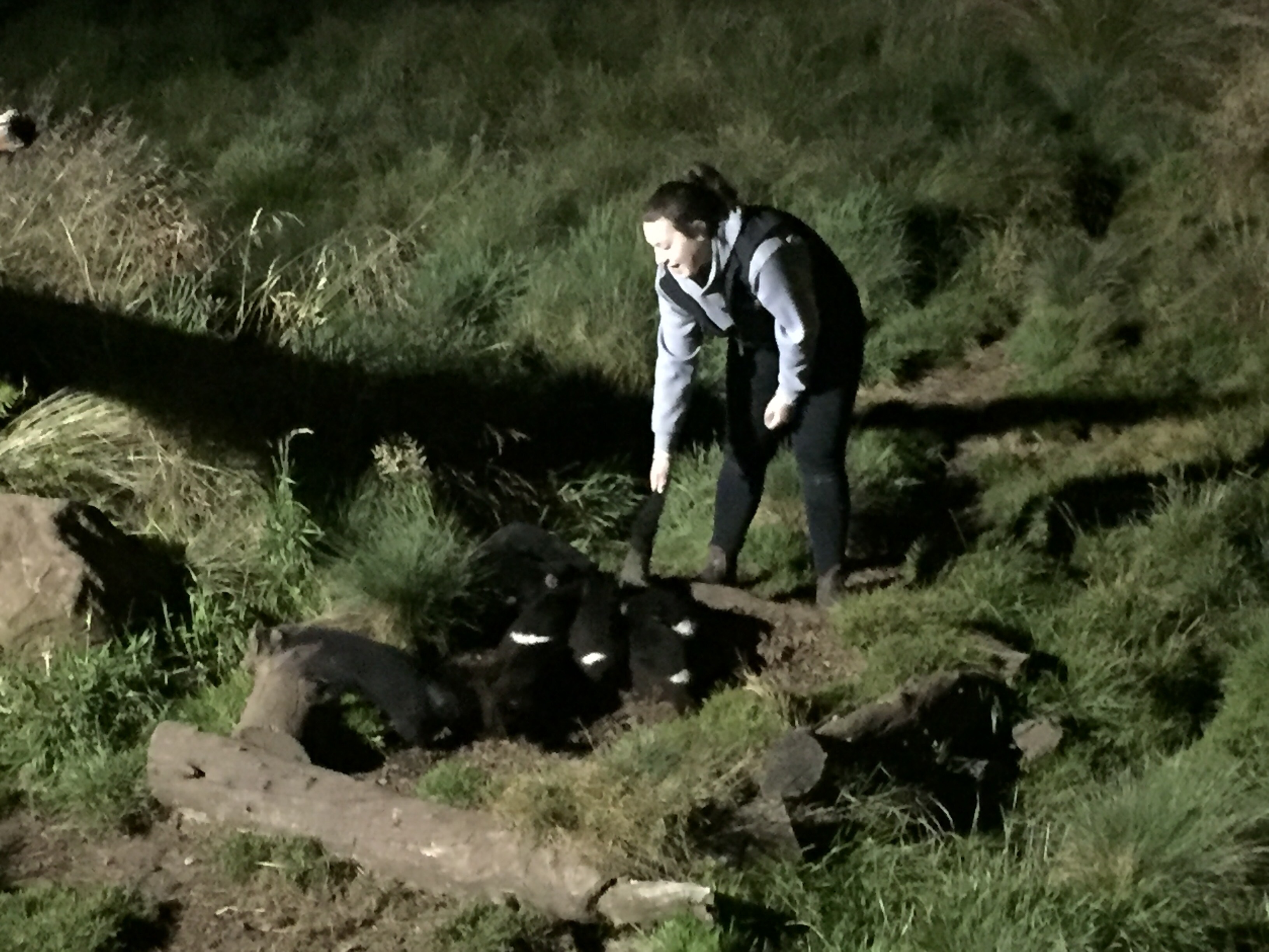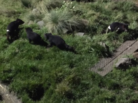 As interesting as this was, our main port of call was the Tasmanian Devil sanctuary. This little creature gained its bad reputation and its name from the early settlers association with. It sounds constantly irritable and aggressive opening it’s pink mouth and baring its teeth to snarl menacingly at the slightest provocation. The English, and European for that matter, had not come across such a creature. As the devils took to living under the new settlers houses, It must have been somewhat disturbing and understandably caused some alarm and displeasure. Hence the name. As half grown devil chaps romped around a big enclosure they looked quite cute. When their night feed came in, in the shape of a dead wombat, there was no question that they are quite ferocious! They eat literally all the animal – the fur to provide the roughage they need as they are totally carnivorous we were told. At a distance we could hear them crunching the bones of their supper. Every now and then a little devil made a dash for freedom with a piece of booty clenched between his teeth. There was a constant yanking and tearing, growling, yappng and snarling until nothing of the meal remained. What started out as a whole dead animal was totally consumed