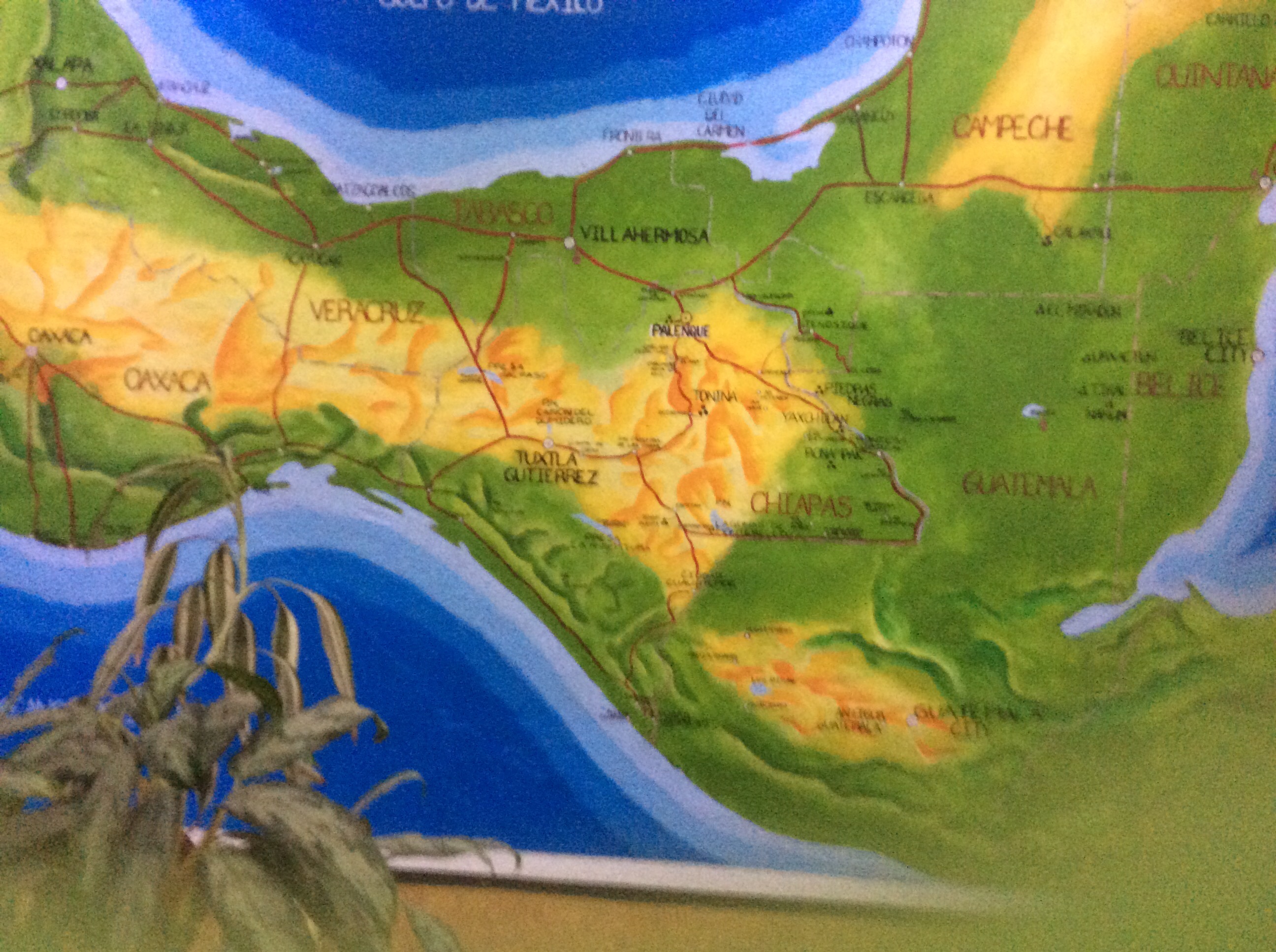 We were in the Lacandon rainforest. Most of the vegetation was green but, now and then, a red hibiscus flower appeared.