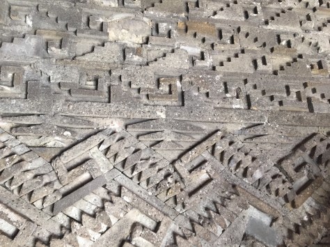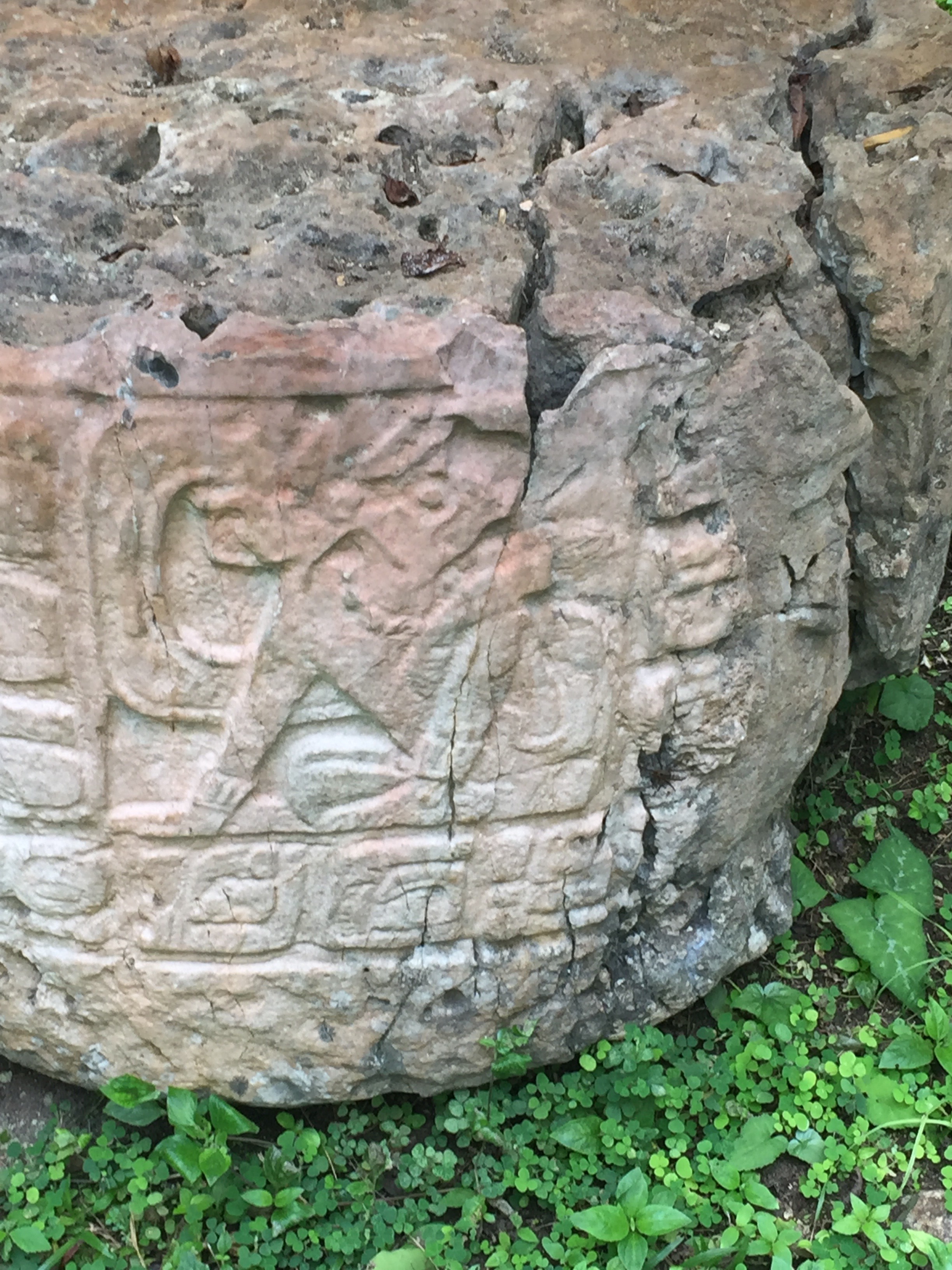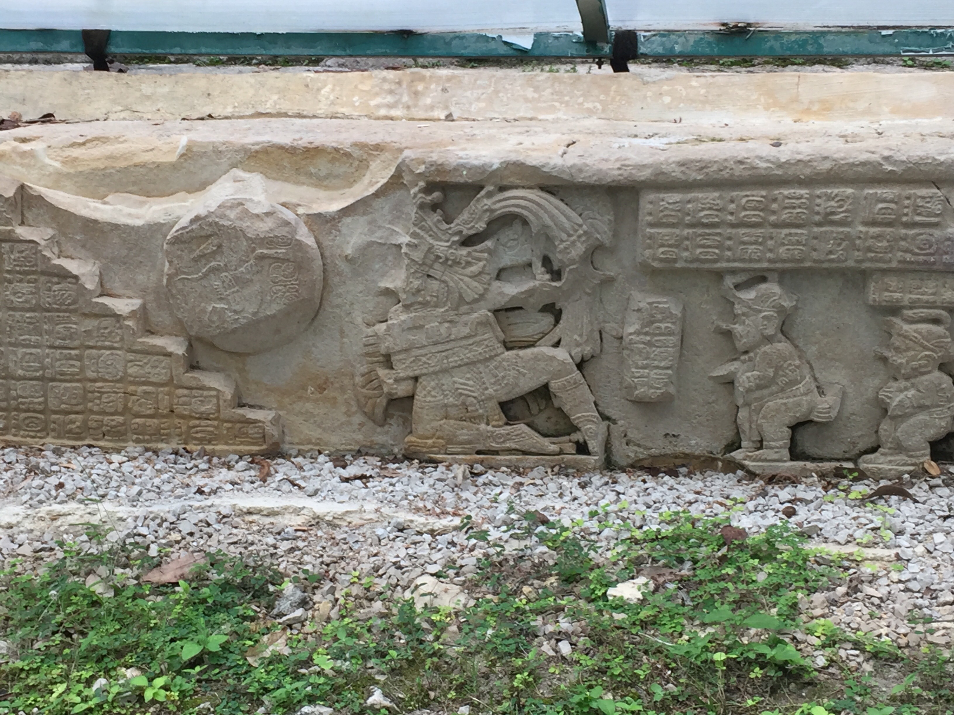 It is the largest building we have experienced. Its steps went on for ever above us. Not everyone attempted the climb. I did and made the summit eventually. The steps were uneven and went on and on. Our reward – a large building with a stone pillar in front of it and some magnificently carved friezes of the ball game, clearly depicting the action of pushing the ball with shoulder and elbow. The building also had the best example we had seen of the ‘roof comb’ the almost honeycombed masonry on the top of the building.