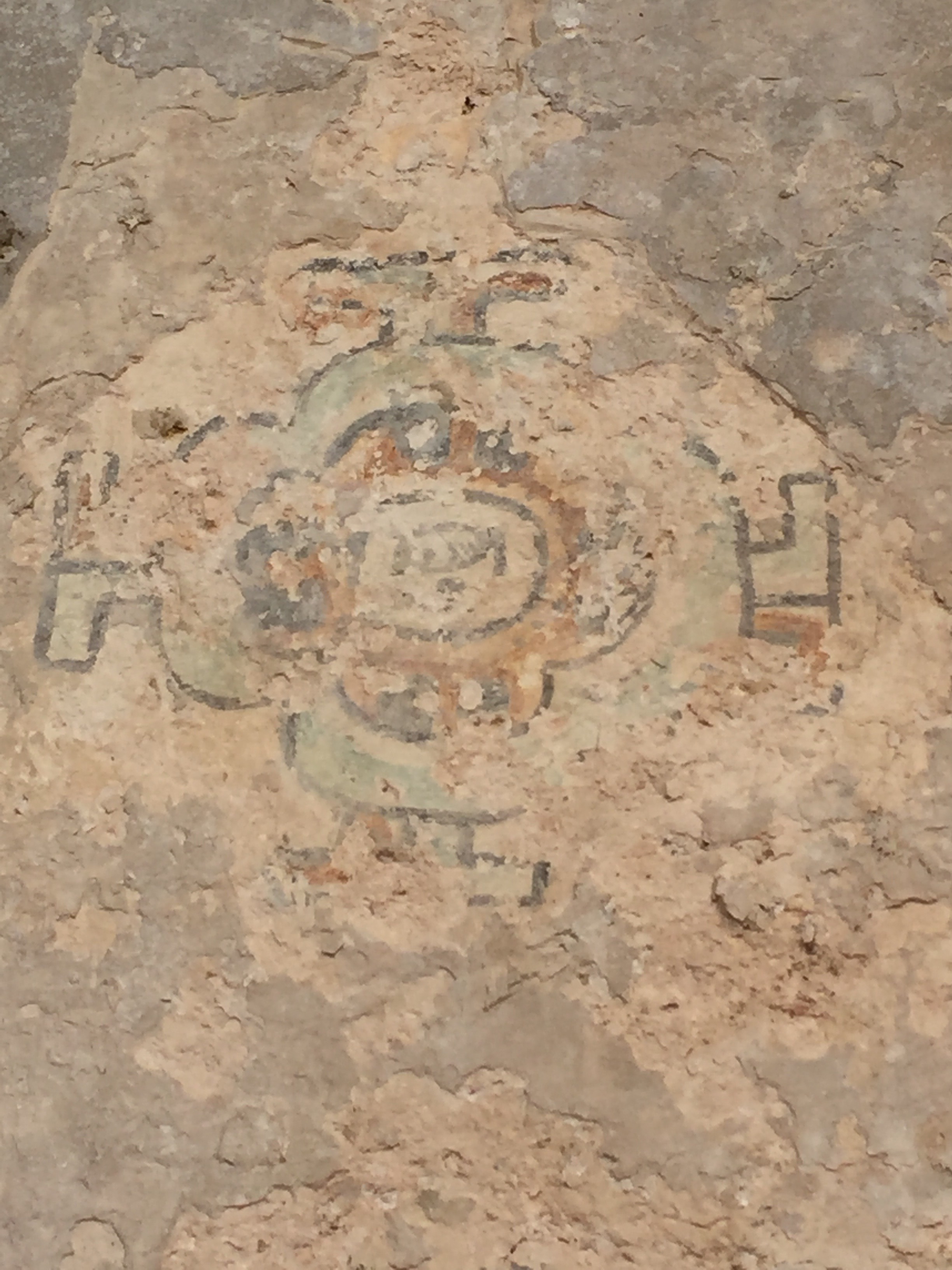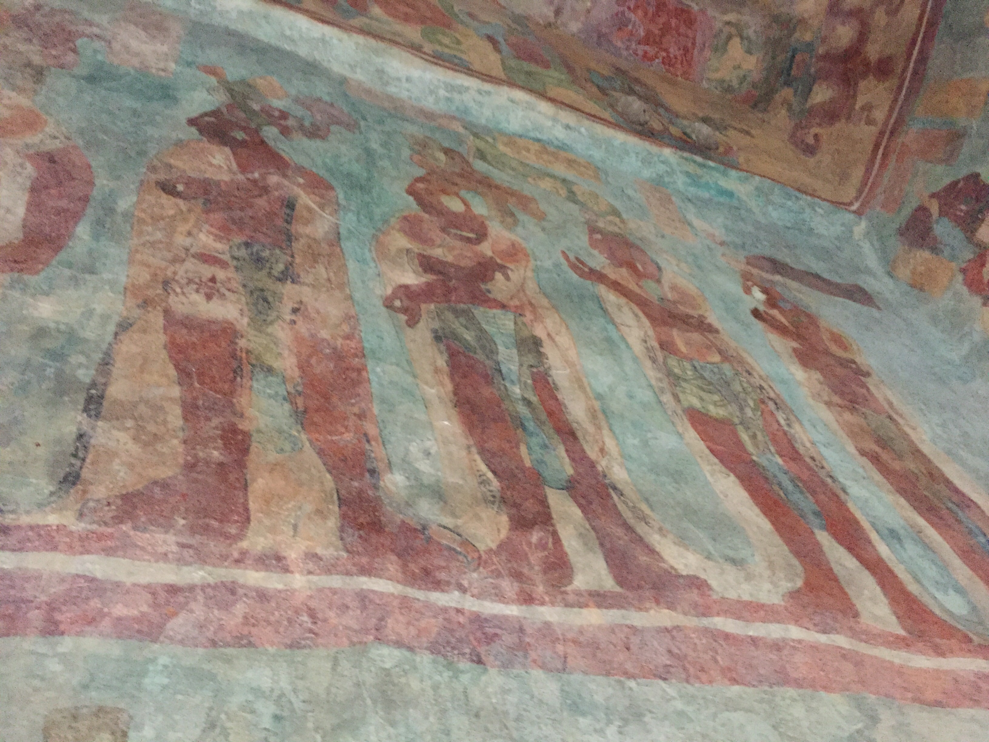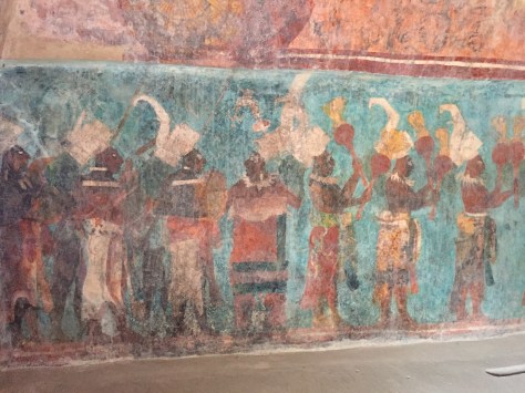 However, before the steps led us up to higher level of the acropolis and the rooms where the paintings are to be found, we saw the stelae showing Chuen Muen on his own and another with his mother and wife – mother in front, wife behind (and who us the most powerful?!). These are both originals, carved with obsidian tools. The minute detail is incredible. I love the sandals!