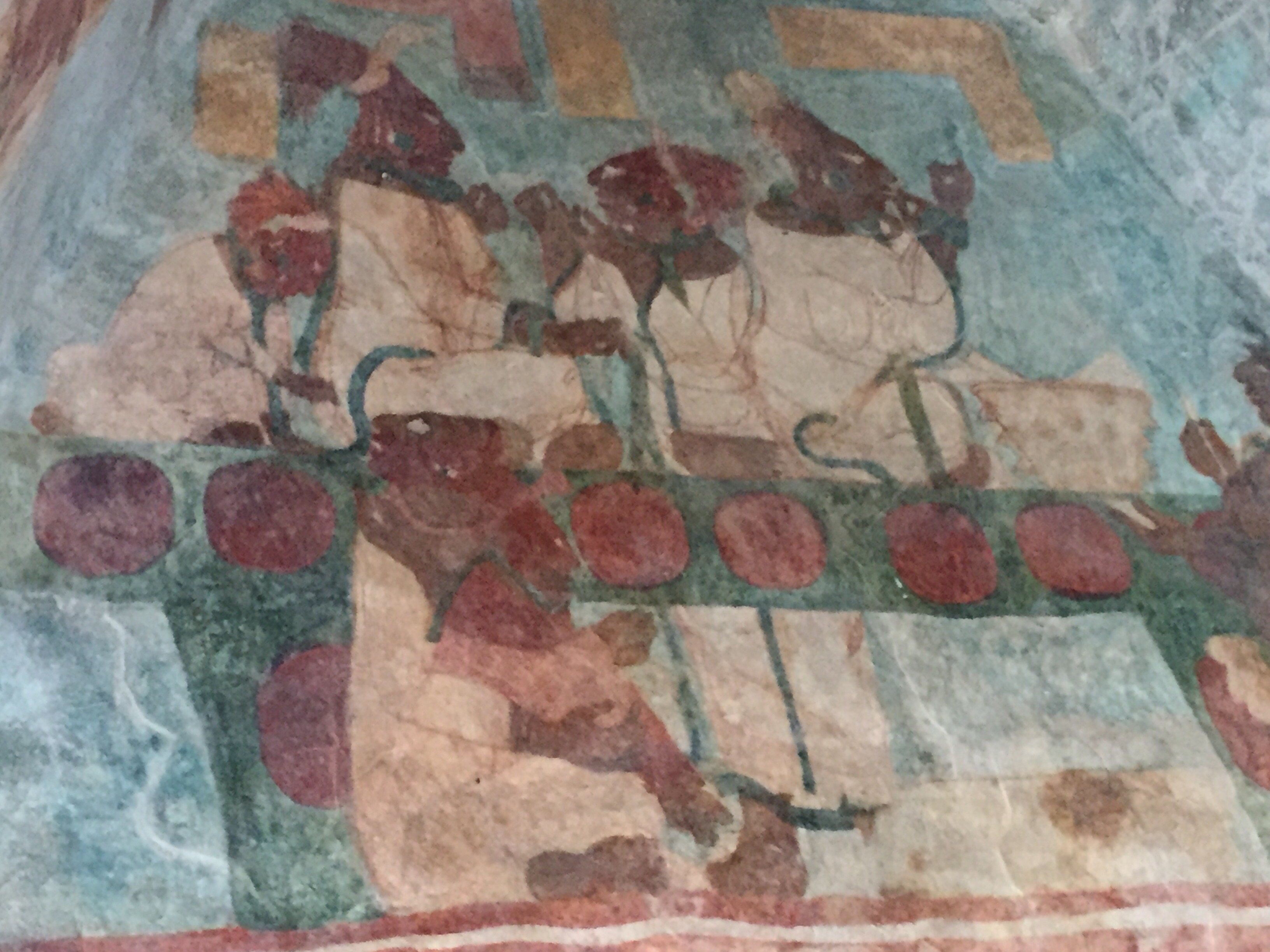 The notable rulers here were Chaan Muen the first and second. The paintings tell the tale of a Mayan society coming to the end of its domination, first ceremonial feasting, then war and then finally showing the ritual perforation of their tongues by the royal women for blood letting.
