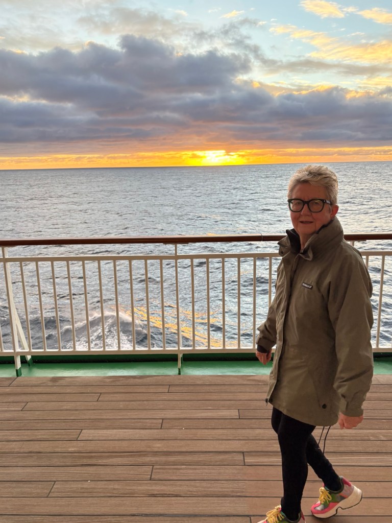 Anyway, back to today which we started with our daily workout with Mr. Wicks, a habit we have tried to get into at home with varying degrees of success. Today there was the added tension of room space but with a bit of jiggery poker we managed it. We then set out for our first perambulation around the ship of the day. It was another beautiful morning but quite chilly – so wrapping up warm was essential. We were rewarded by amazing skies and the opportunity to come across a few more of our travelling companions. Here it may be time to talk a little more about the ‘tribe’ we have unwittingly joined for the duration of the journey…..