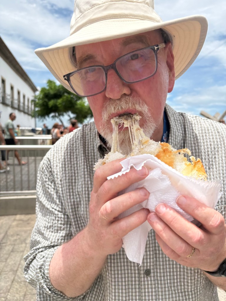 We then decided to wend our way back to the ship, but on the way stopped to sample the street food. First was a tapioca based pancake filled with meat and cheese