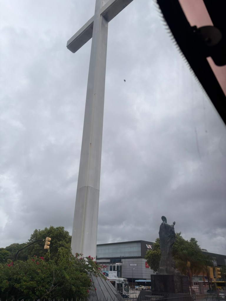 The Pope John Paul came to Uruguay a few years ago and since then A cross and statue of him has gone up. It has gone up so quickly we wondered if the Pope brings his statues with him in kit form, so people can plant them immediately he leaves…. Apologies for the photograph it was taken from the bus.