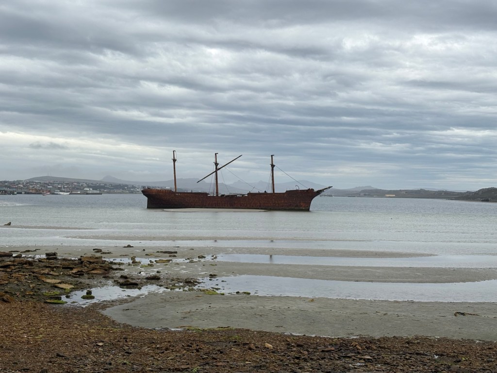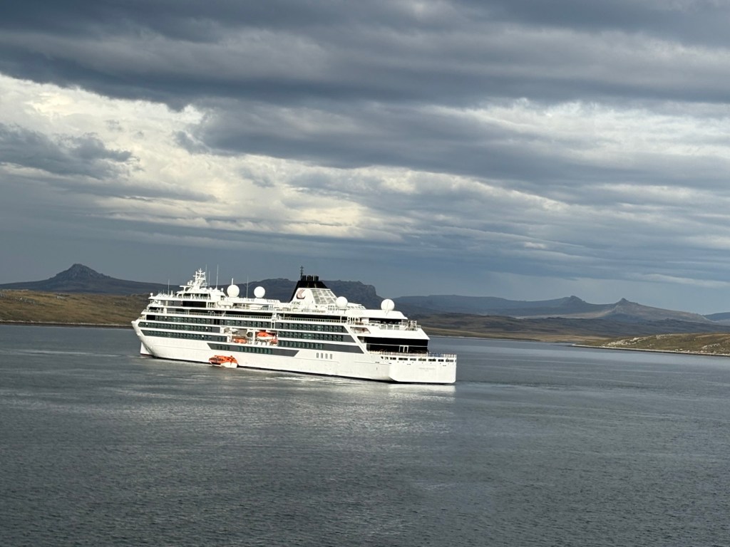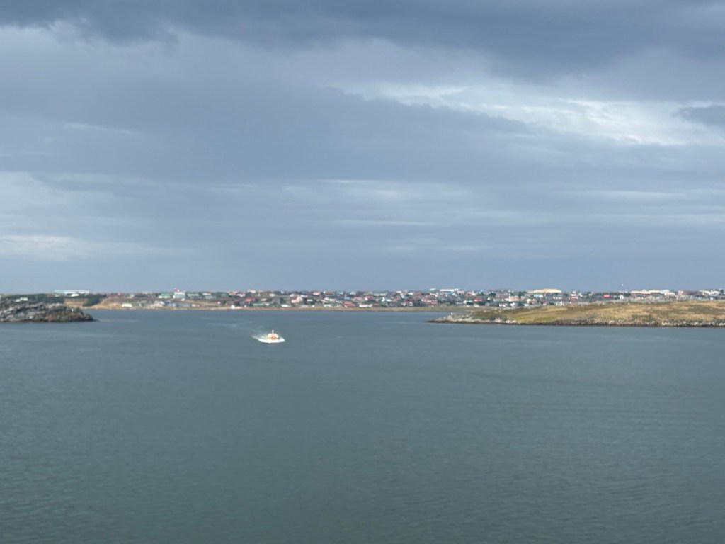 I woke to the sound of the anchor being dropped at about 5.00 a.m. Peering out of our window it was very misty but there was definitely land out there. We went out on deck at about 6.00 and the mist had lifted and a watery sun was peaking out between the clouds and gradually Port Stanley and other islands have emerged.