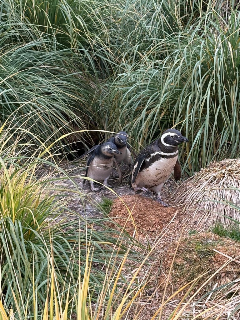 Our walk ended with penguins. First at Gypsy Cove, a small cove with a crescent of white sand. Before we reached the Cove itself there was an area with lots of tussock grass. Here we found Megallanic Penguins in their burrows which don’t go down but along underneath the grasses.