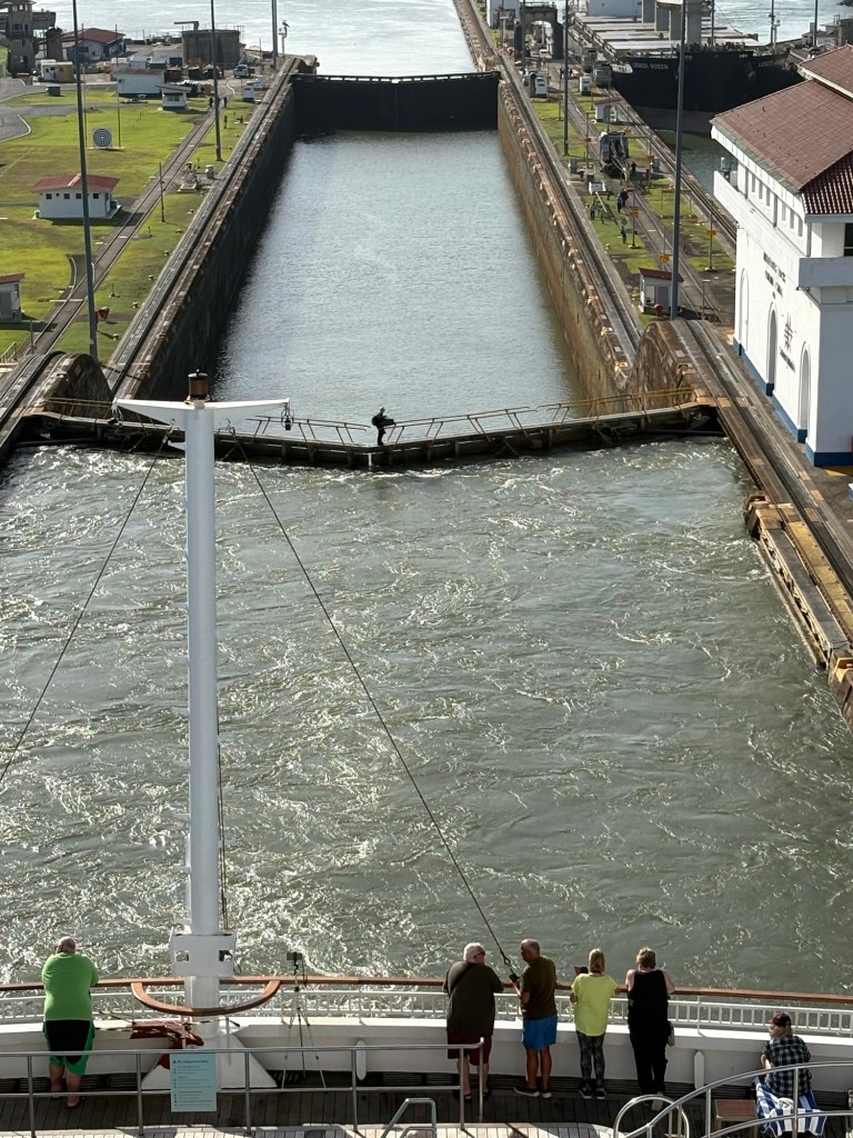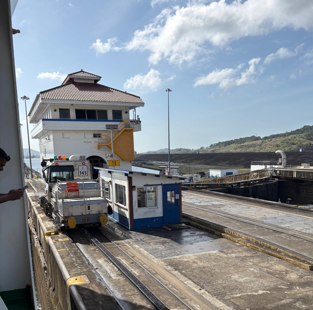 There is a sort of sedate progress through the locks, as with so little wriggle room, the ship has to be in exactly the correct position to move through – and this is where the ‘mules’ come in. These are electrically powered towing locomotives that run on rails on both sides of the ship and are attached to the ship by wires. They effectively steady the vessel through the lock.
