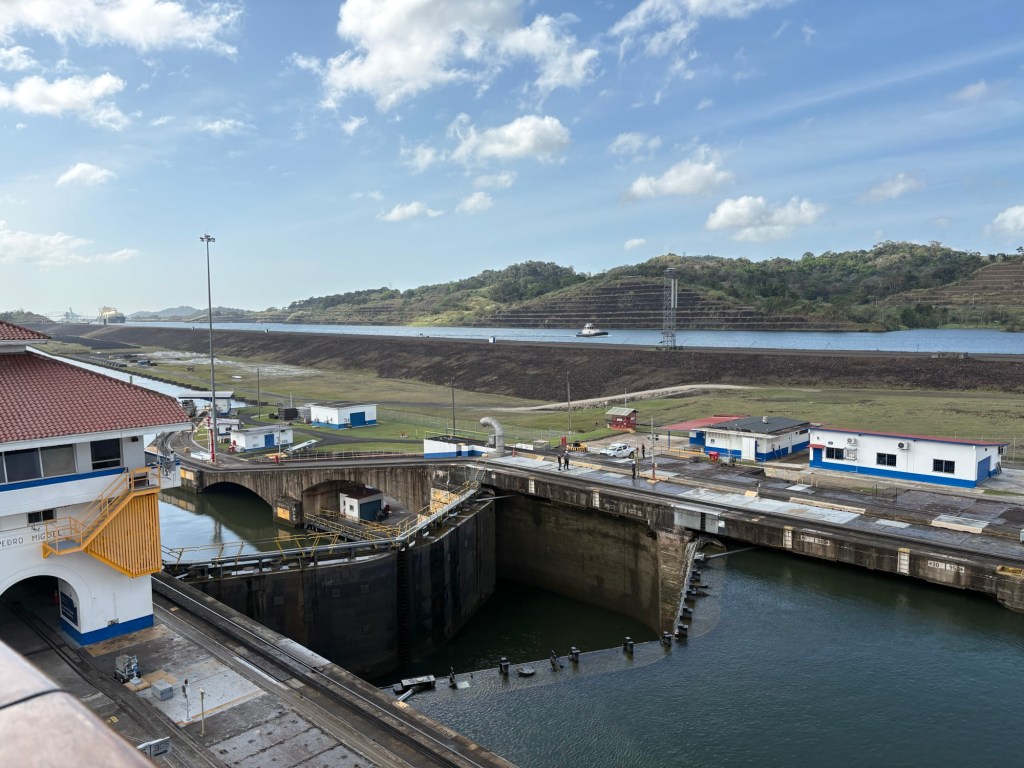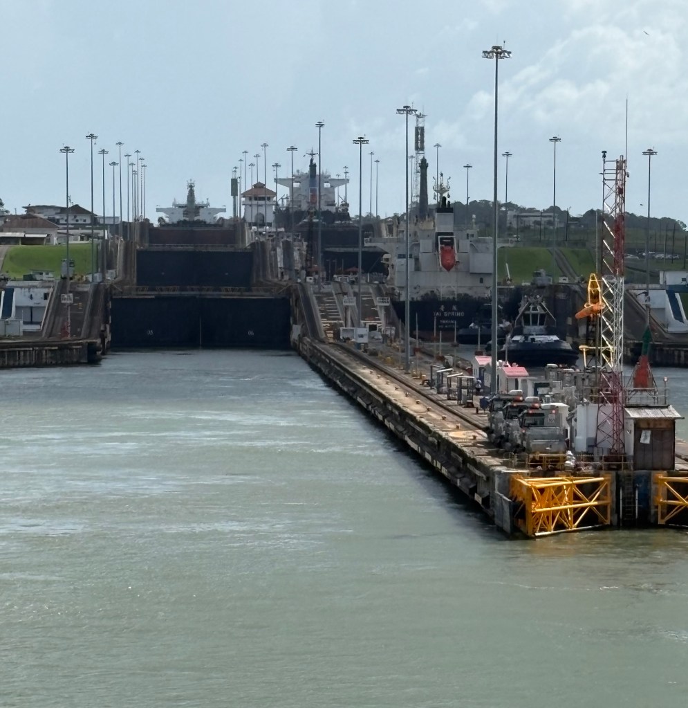 We had now reached the highest we needed to be and at the next locks – the Gatun Locks we had to descend to the level required to join the Caribbean Sea. These locks had to be created out of a hill and involved major excavation. They consist of three chambers or steps and each level must be safely completed before the next drop.