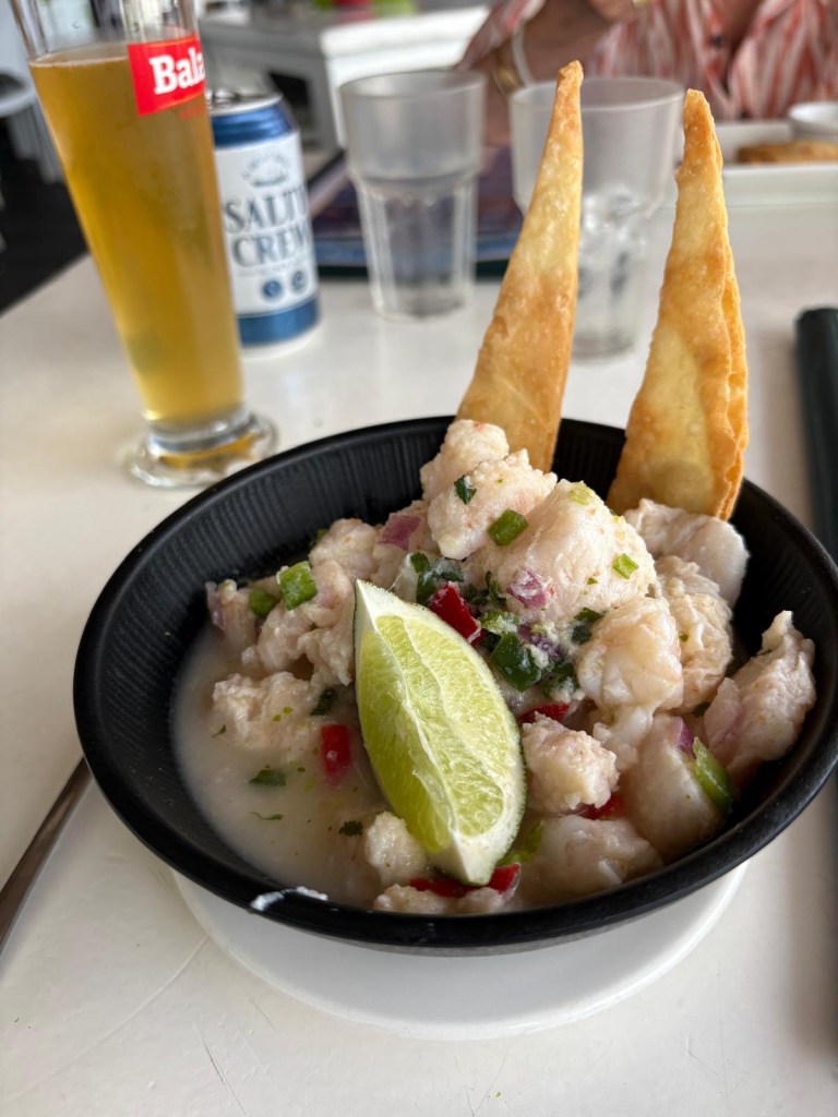 Next came the food. I had West Indian samosas followed by barbecued Chicken and Ribs and Keith had what proved to be the best Ceviche he has had so far he tells me. It was served in Leche de Tigre (Tigers Milk). He followed this with local fish,