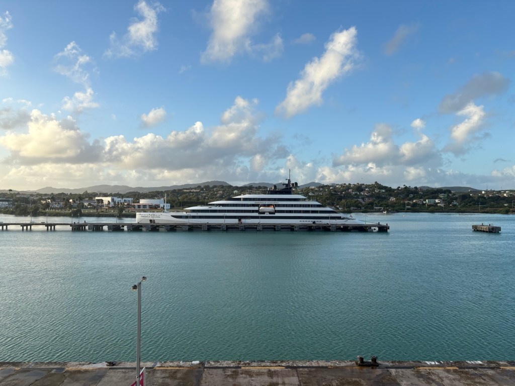 Although it started cloudy, by the time we got to the promenade deck the sun was out and everything had warmed up. There was rather an exotic ship moored across the way…..