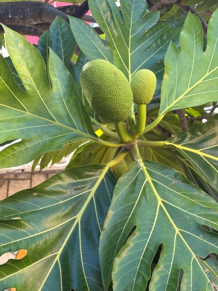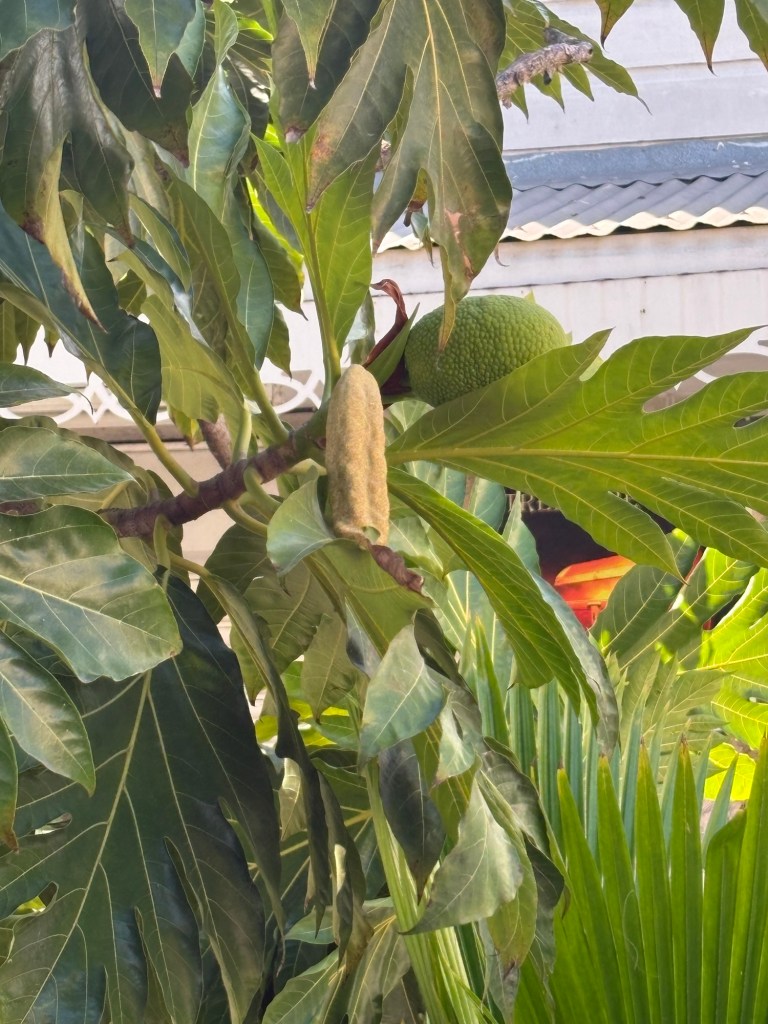 In the garden of Redcliffe Quay were some smaller breadfruit than we have seen before and some in its early growing stage.