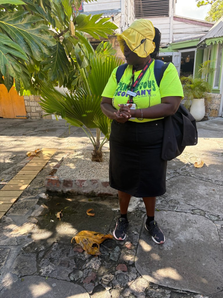 Anyway, putting that to one side, we were booked on another foodie experience this morning and by the time we joined them on the dock at 9.30 the temperature had risen to 27 degrees and it was quite windy. 12 of us set out under the guidance of young Natasha, a very bubbly Antiguan lass modelling a very dashing yellow bonnet!