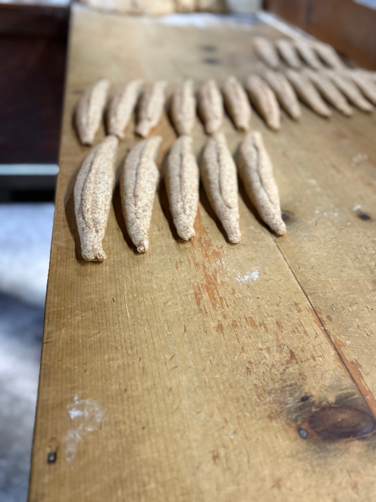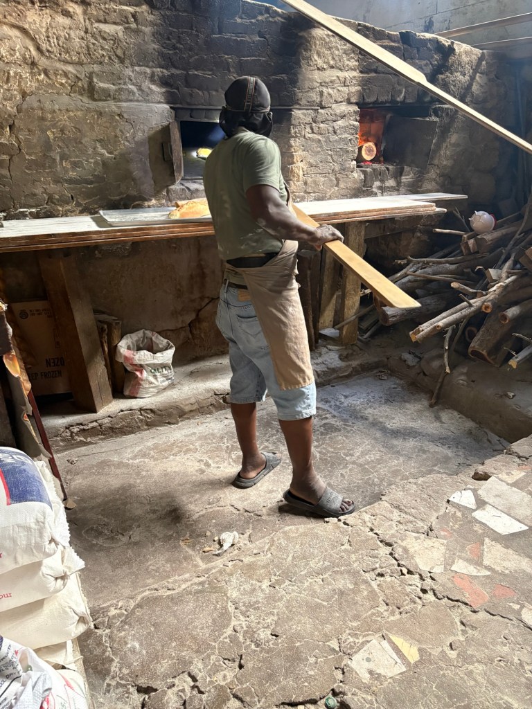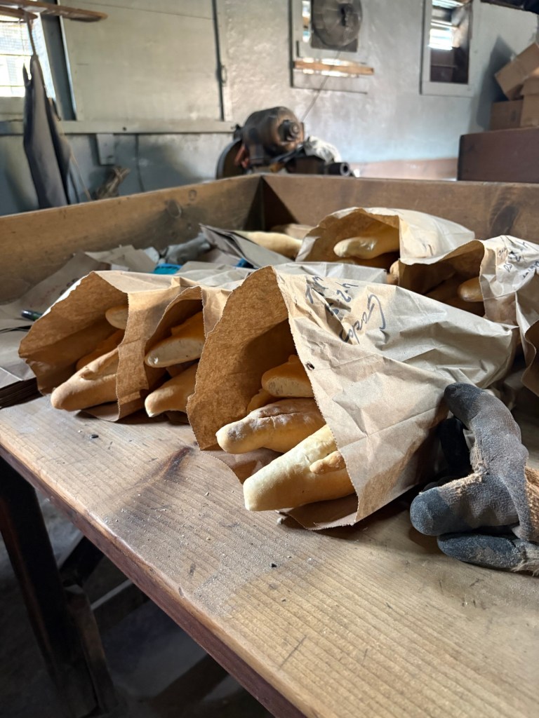 Behind us the bread was being kneaded, cut into pieces and then set to rise. A young and very lively chap talked us through the various processes and all the time customers were coming in and out for bread. There were bags of five loaves ready to be collected. It was a veritable hive of industry – and it was hot in there! 🥵