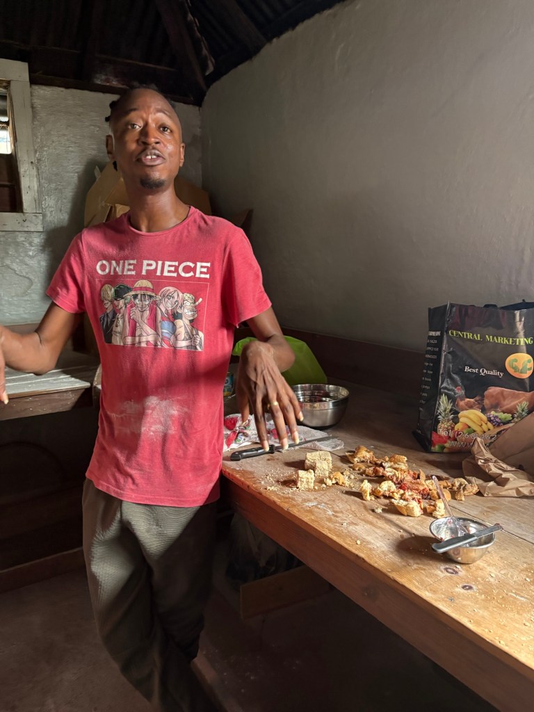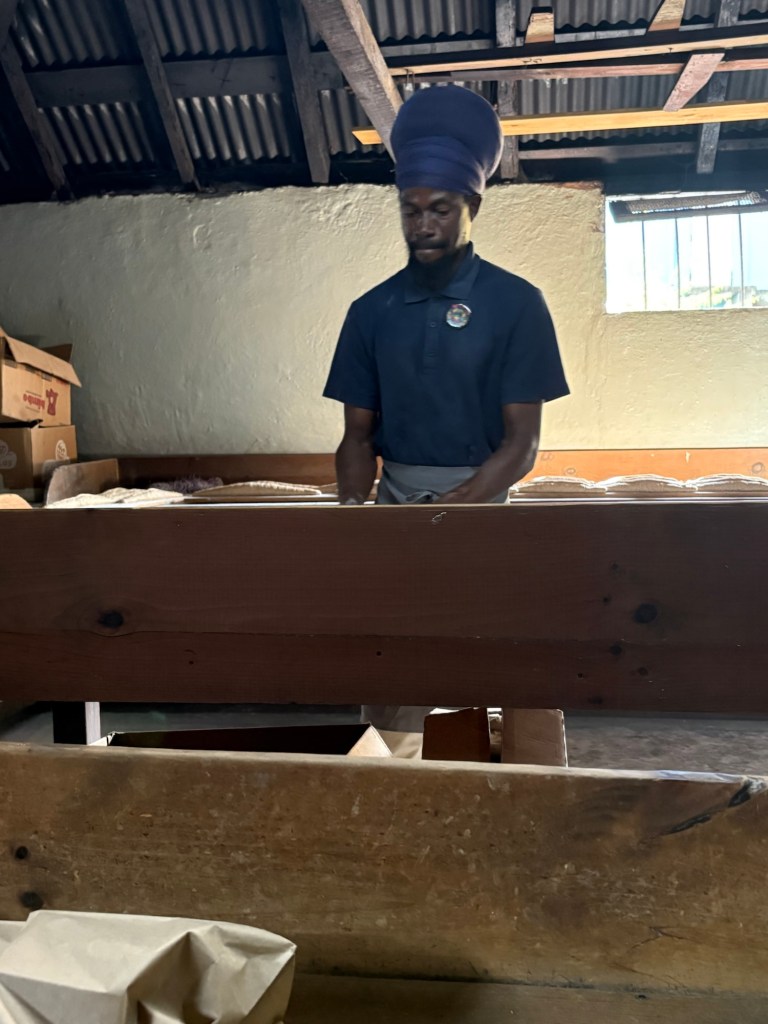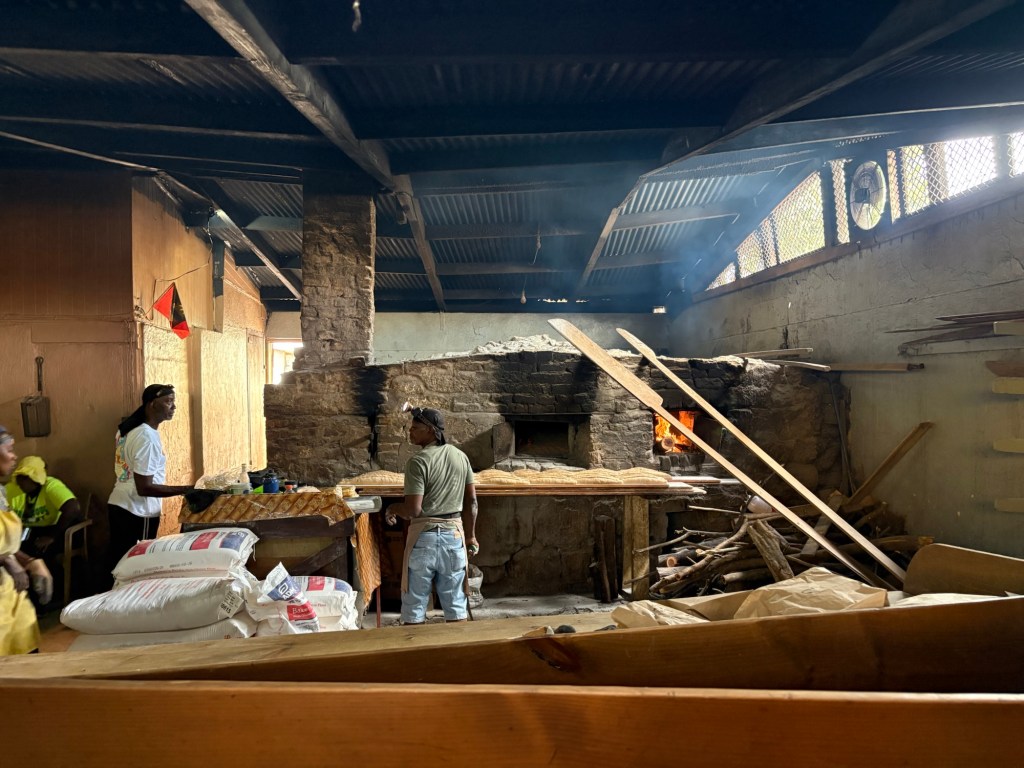 Mein host who was taking us through the bakery’s activity did so with great enthusiasm and pride, provided bread to try and ‘go with’s’. There was a sweet, honey based mixture, guava and then a very tasty ‘comfort mix’ of sweetened milk, raisins, cherries soaked in rum and wine and honey. This he put in a baking tin and then opened up a baton of bread and laid it over the top and put it in the oven. When it was cooked the bread was turned out and then carved up and basically the bread was covered with a spicy mixture. It was very heartwarming and as the man said – there was love in every bite!