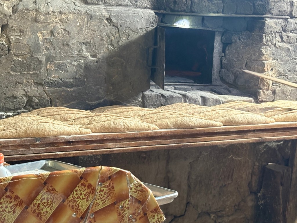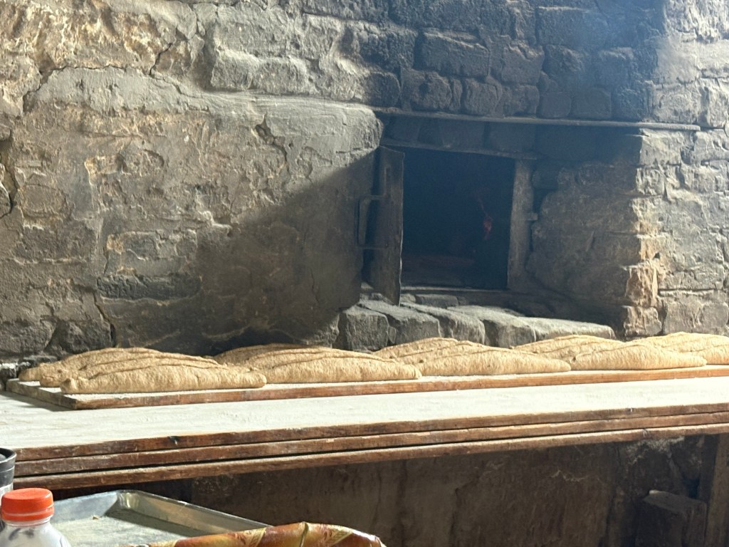 From the market we went on to the bakery – which was a new and excellent experience. Outside wood was piled up to fire the big communal oven inside. On the inside the scene was almost medieval – except for the oven master’s head torch which allowed him to see inside the vast oven.