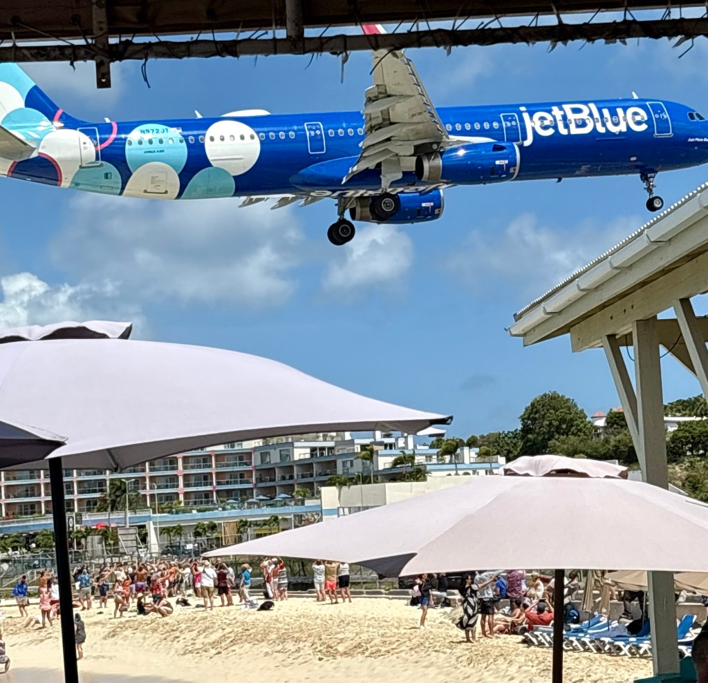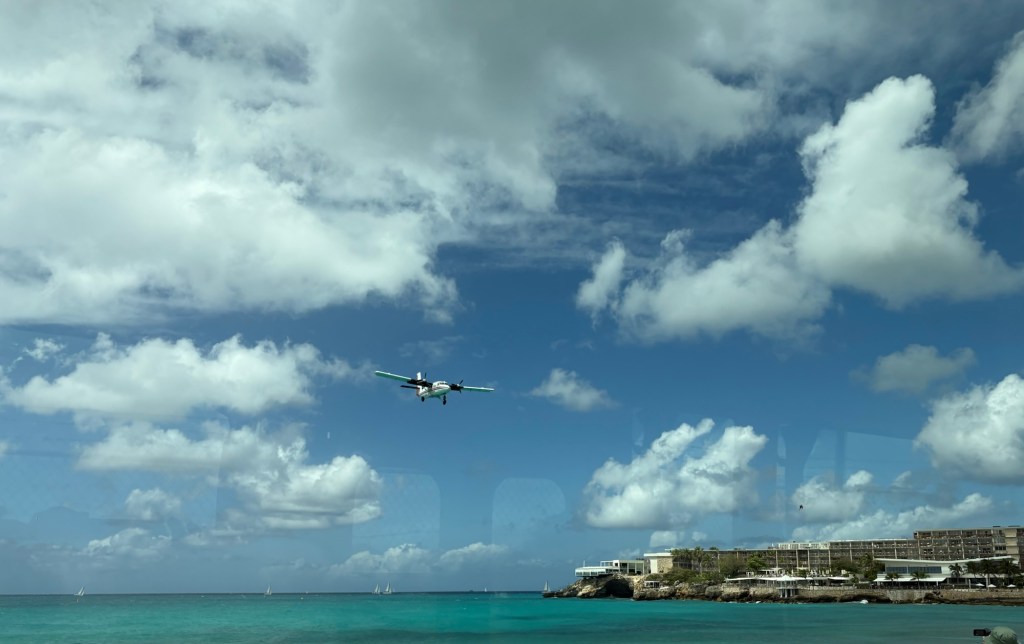 We then clambered back on the bus to take us to the famous beach where planes fly very low over it to land at the international airport. To all intents and purposes it looked a small but pretty ordinary beach. Bur then a plane came across and you could see how low it was!