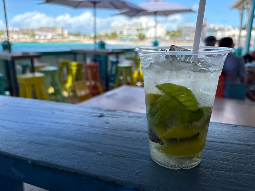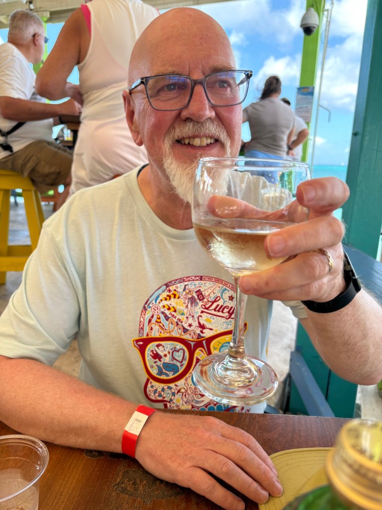 We had a birds eye view from the bar where we were sitting having an early lunch. I had my last Caribbean cocktail – a very nice mojito with lots of lime and mint and Keith had a glass of wine.