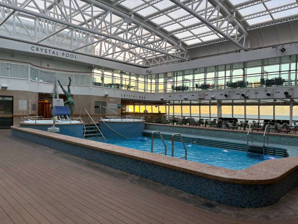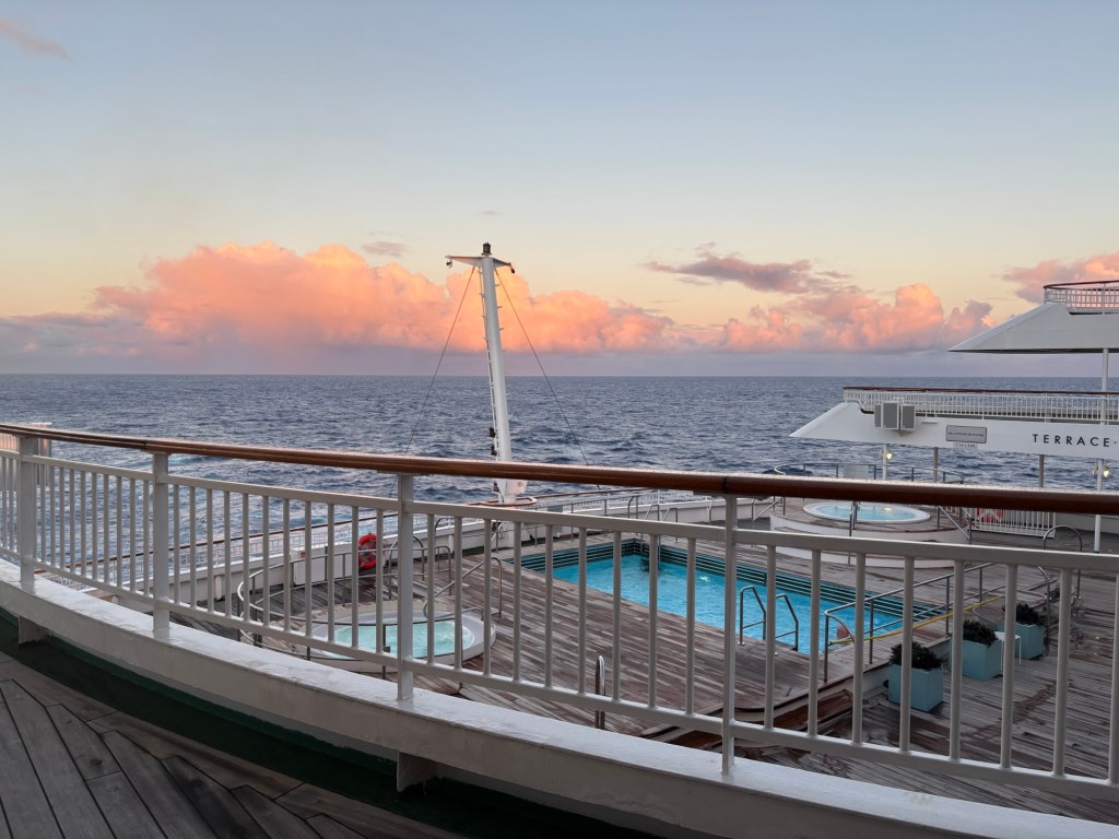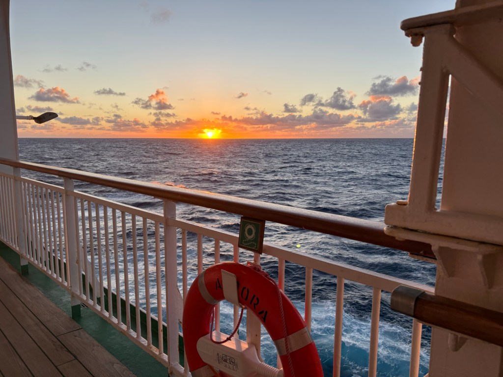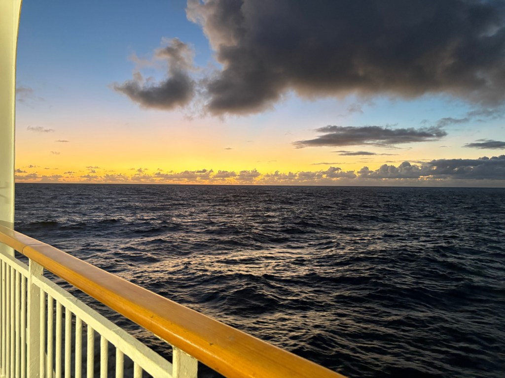 We had a light lunch and then back to the cabin to make up for the hour that we lost this morning with a few zzzz’s. We then went our separate ways – Keith to watch the football and makes notes for his novel and me to do a bit of sunbathing and my crossword. An afternoon shower sent the sunbatheratti scattering. I do love it when that happens! I completed the crossword I was doing – I was under cover – and then sauntered back to the room to finish the novel I was reading.