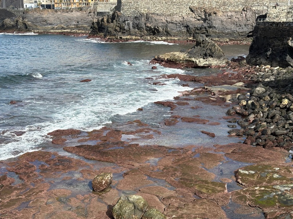 This is an area called La Canteros, On the seaward side of the route was an expanse of larval rock running into the sea. This area is of special scientific interest due to the algae which attaches itself to it and turns it pink.