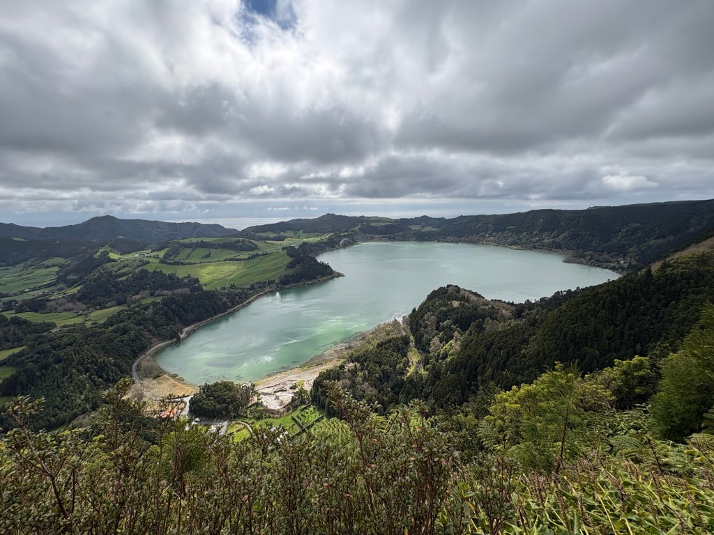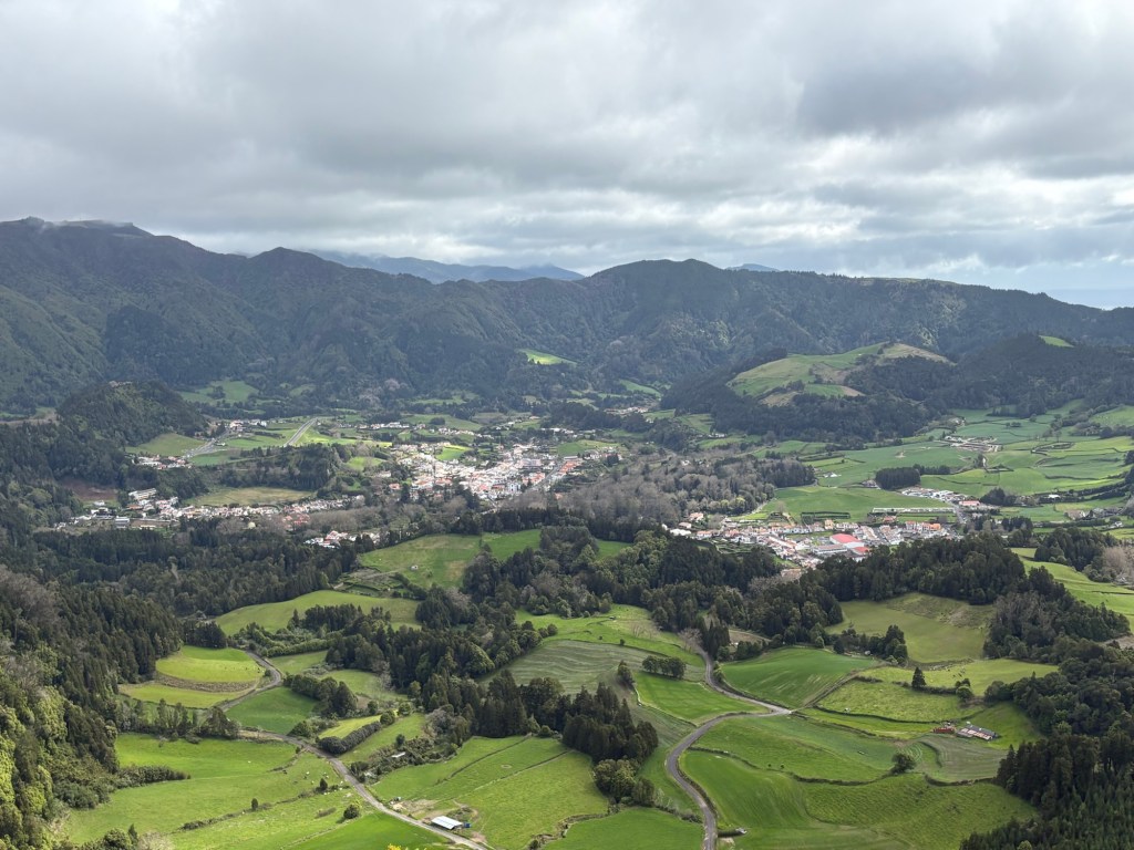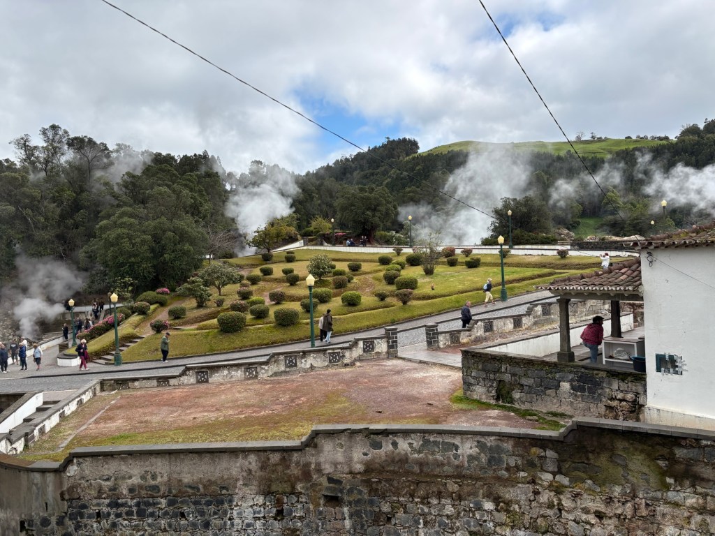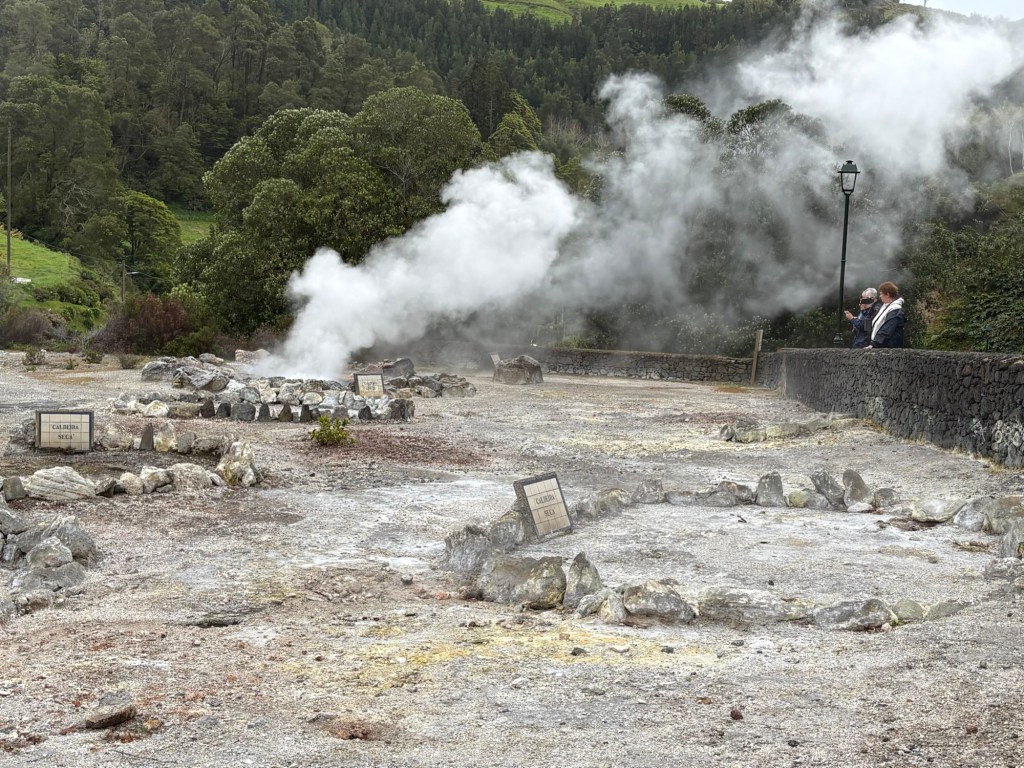 Our next stop was the volcanic lake at Furnas. By now the sky had lightened up. I have to say that the scenery outside of the towns is very much like Derbyshire we thought. Farming is one of the main occupations of the Azores and in addition to growing tea and raising cattle, they grow pineapples on the Azores. Another ‘who knew’ for me.