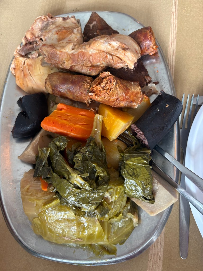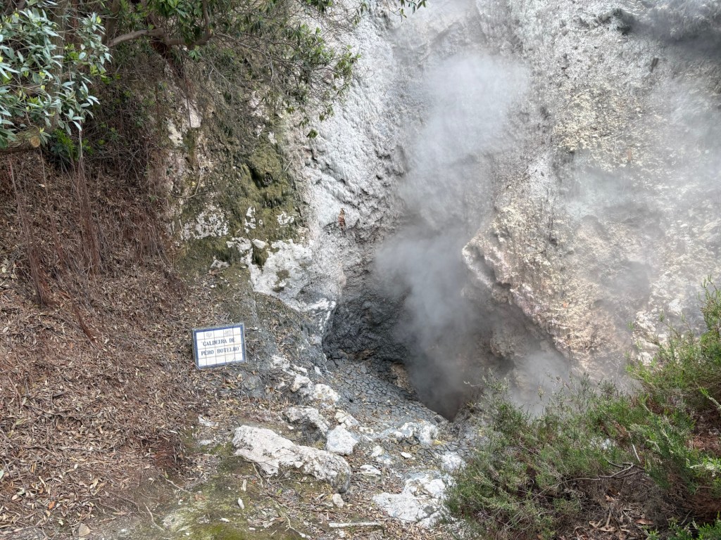 From the lake we travelled down to Furnas Village to our lunch stop. Here we were to experience the Cacido or volcanic method of cooking. More specifically we were going to have Cozidos das Furnas a world renowned speciality. The technique involves lowering large metal pots into hand dug holes in the steaming earth. The ingredients are layered strategically to ensure even cooking. Once the pot is full it is sealed and then lowered into the hole on ropes and buried under a mound of volcanic soil. There is no added water or oil, the ingredients cook in their own juices for six to seven hours. It was delicious!