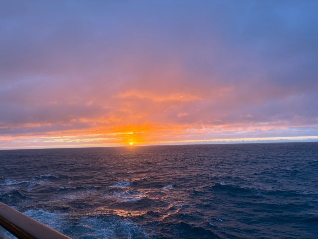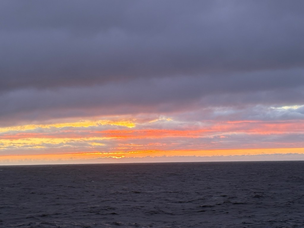 There was not the usual early rise this morning as there is no 9.00 a.m. ukulele. Even so, we were still on deck just after 7.00 to see the sun rise.