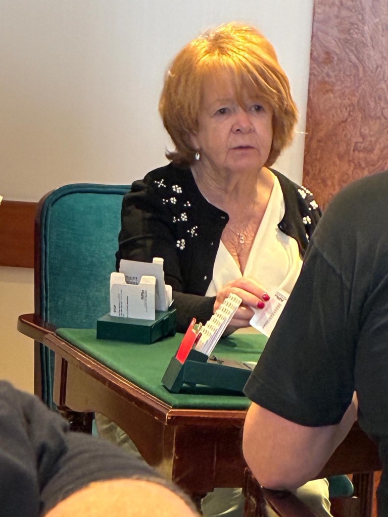 In the end I did decide to go to ukulele to meet up with my chums and after that we played Bridge. Both activities were in question, but both happened. I think we are much more concerned about the whole packing issue than those old hands at this cruising lark who haven’t even thought about it yet. We are still at the ‘obeying the rules’ stage! We have really enjoyed both of our chosen pursuits and have made chums with those we have played with on both counts. Just so you could picture her, I took the opportunity of getting a picture of Maureen the Bridge Wizard. How does she keep all of those rules in her brain?!?