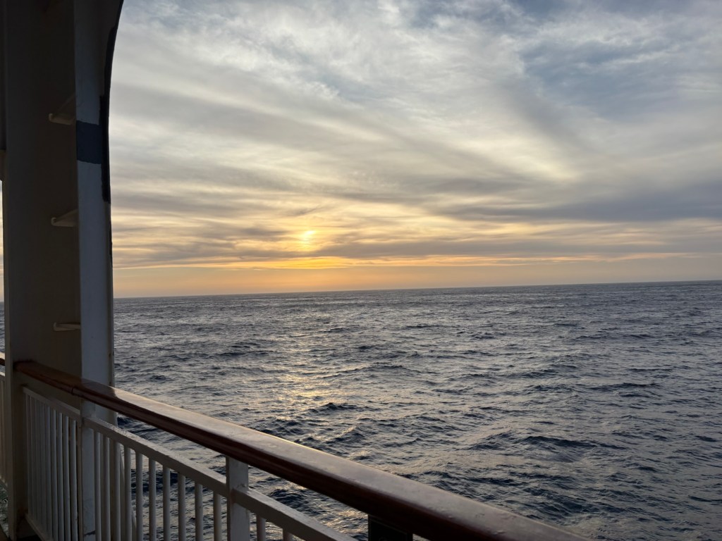 No real pressure today, but we were on deck just after 7 for our daily walk. The sun was a bit weak – but much brighter than yesterday.