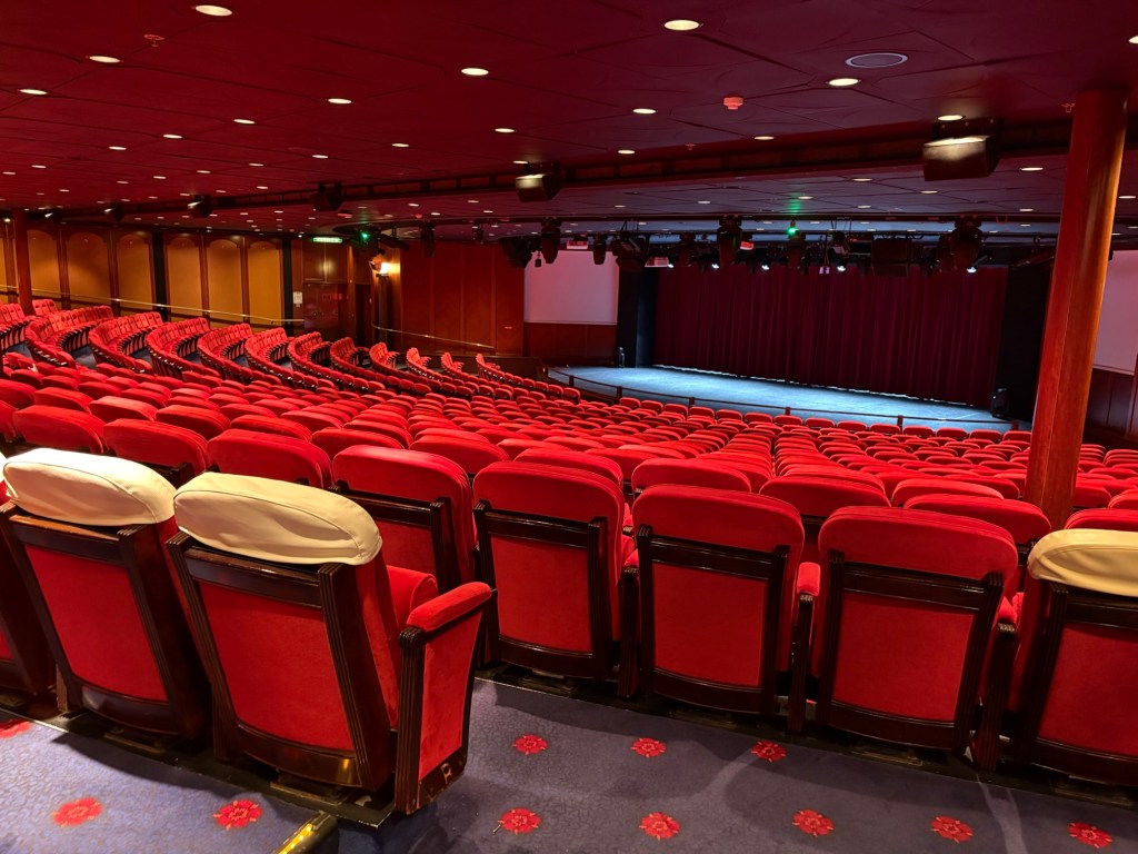 After dinner we adjourned to the theatre to be entertained by two highly skilled musicians, one very Irish guitar player and the other an amazing Scottish, kilt wearing violinist. They were extremely talented but let themselves down a bit with the songs that they sang, The theatre is very plush. It was full to bursting this evening!